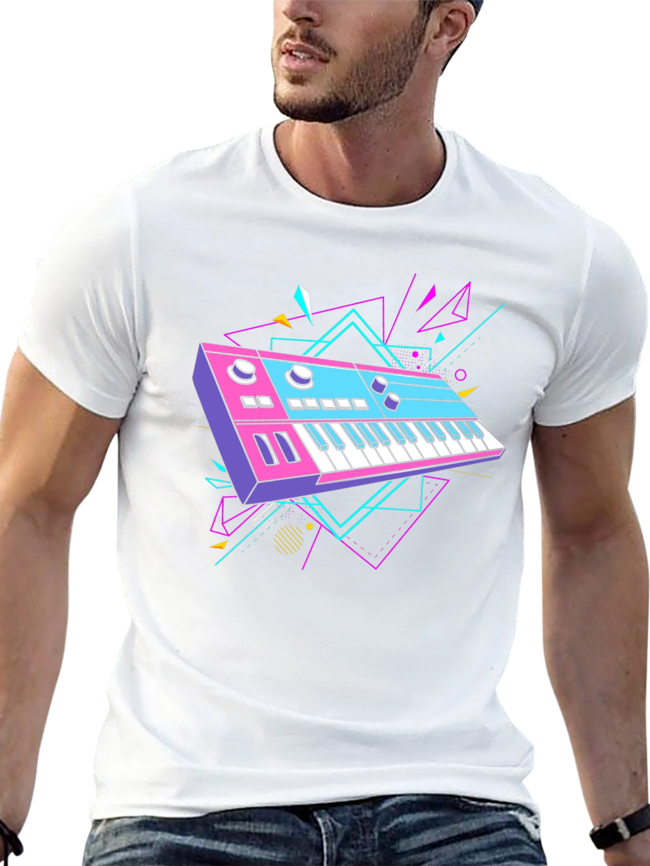 Embrace retro vibes with this eye-catching black t-shirt featuring a vibrant synthwave keyboard graphic. The design incorporates neon geometric shapes in pink, teal, and purple, creating a visually striking, 80s-inspired aesthetic. Made from a comfortable, soft fabric, this tee is perfect for casual wear, music lovers, or anyone looking to make a bold statement. Its unique design is sure to turn heads and spark conversation. Ideal for concerts, parties, or everyday wear, this t-shirt adds a touch of vintage cool to any outfit. Express your love for synthwave music and retro style!