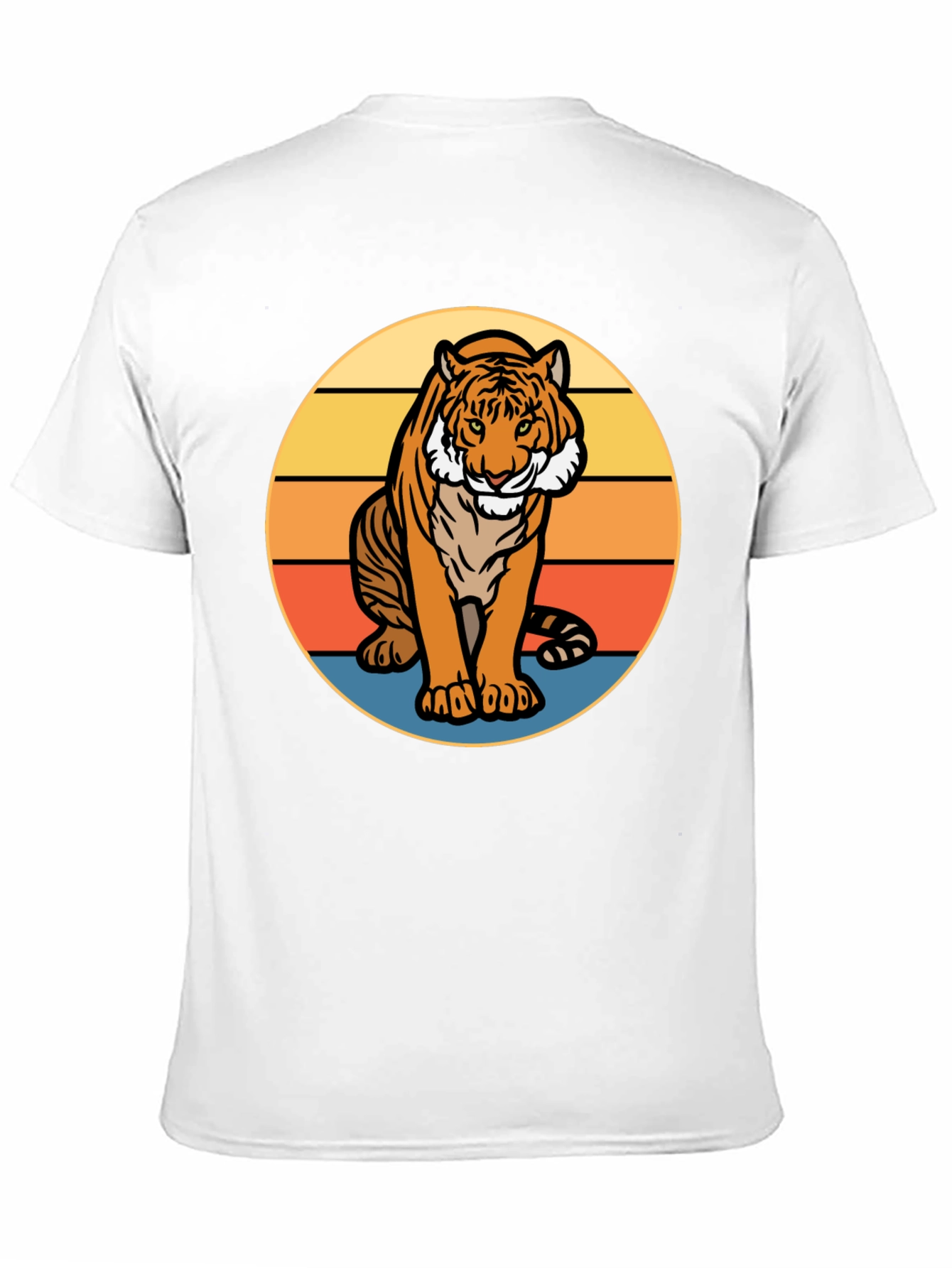 Showcase your wild side with this retro-inspired graphic tee! Featuring a vibrant tiger illustration set against a classic sunset background, this black t-shirt is a stylish statement piece. The design has stripes of yellow, orange and blue. The graphic gives the impression of warmth and adventure. Made from a comfortable, soft fabric, it's perfect for everyday wear. Pair it with jeans for a casual look, or dress it up with a blazer for a night out. This unique tee will turn heads wherever you go. Grab yours today and unleash your inner tiger!