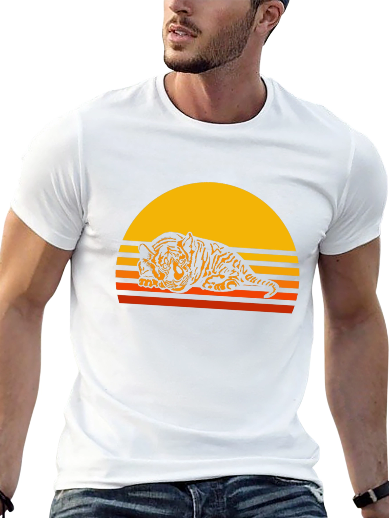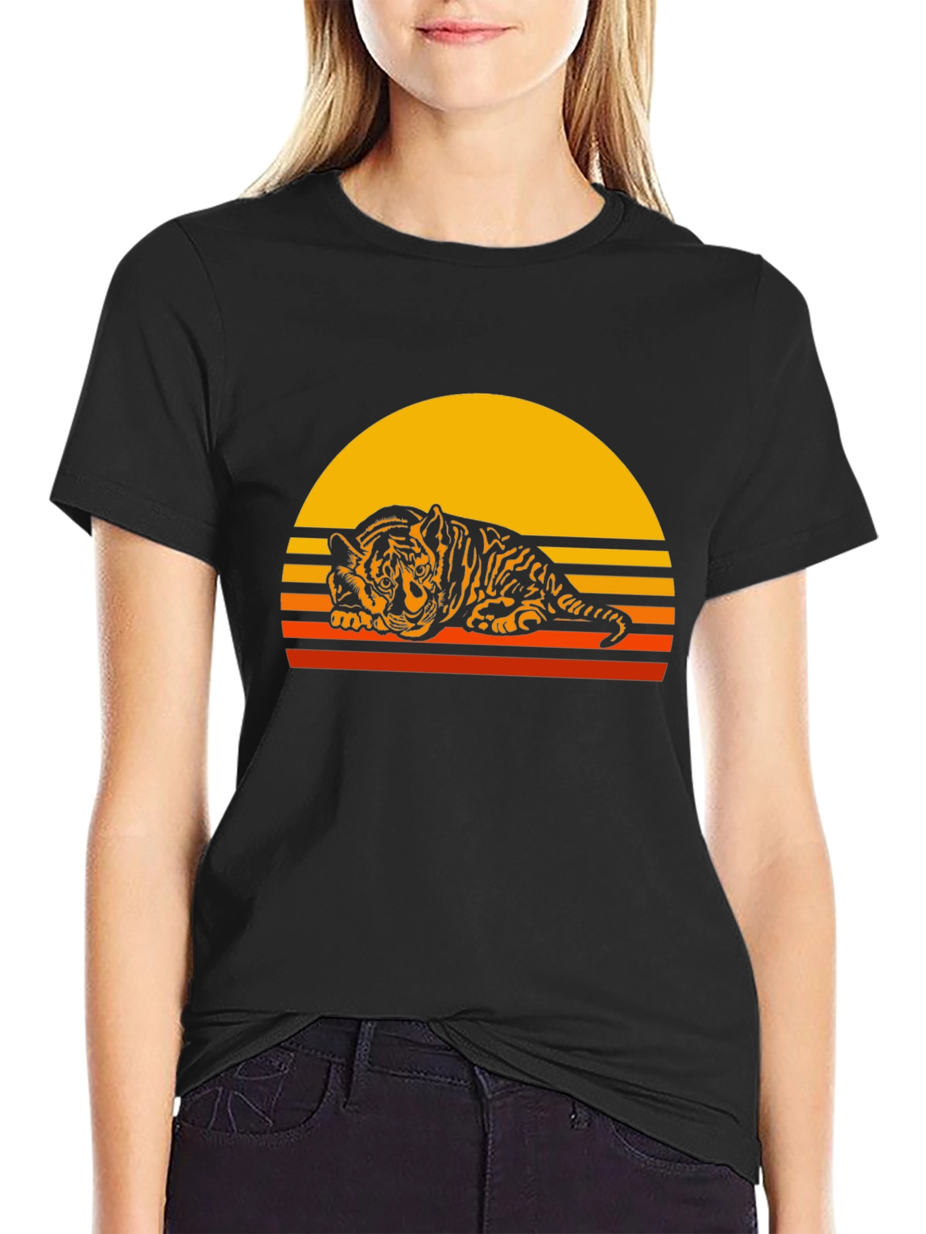 Show off your wild side with this unique tiger graphic t-shirt. The shirt features a black and orange tiger design set against a retro sunrise backdrop, creating a cool vintage vibe. Made from a soft, comfortable fabric, this tee is perfect for everyday wear. The classic crew neck and relaxed fit make it easy to style with jeans, shorts, or even a skirt. Whether you're headed to a casual hangout or running errands, this t-shirt is sure to make a statement. Add some fierce flair to your wardrobe and get yours today!