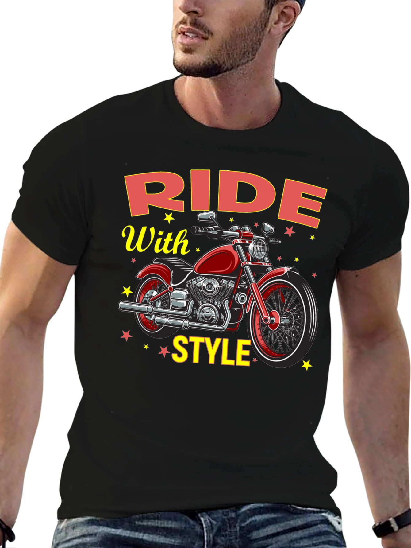 Show off your love for motorcycles with this stylish graphic t-shirt! The black tee features a vibrant red motorcycle design, complete with the words "Ride With Style" in eye-catching yellow and red lettering. Made from a comfortable, breathable fabric, this shirt is perfect for everyday wear or for your next biker meetup. The classic fit and bold design make it a great conversation starter and a must-have for any motorcycle enthusiast's wardrobe. Whether you're hitting the open road or just hanging out with friends, this tee is sure to make a statement.