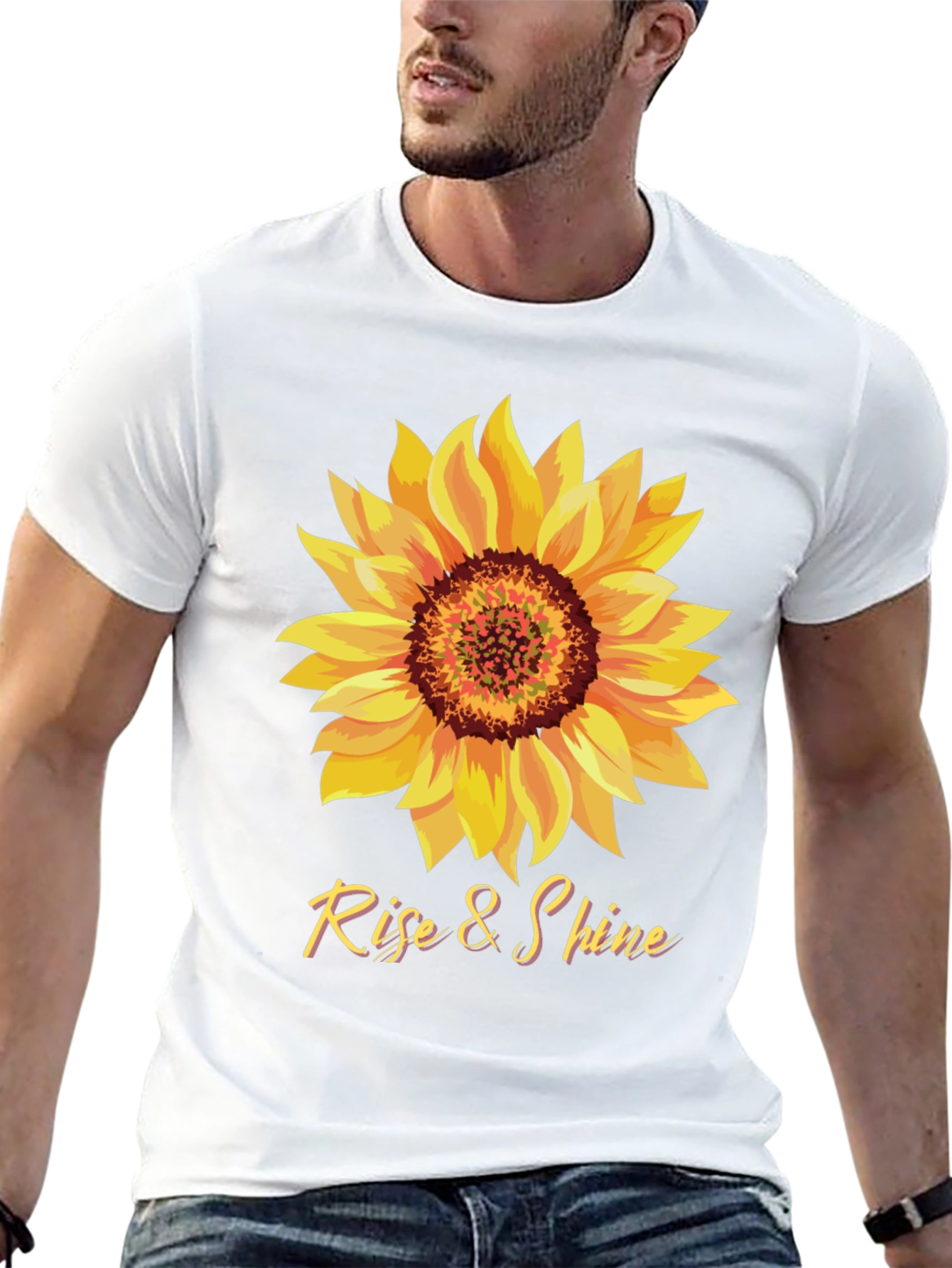 Brighten your day with this stylish black t-shirt featuring a vibrant sunflower graphic. The design includes a detailed sunflower with a yellow and brown center, paired with the inspiring words "Rise & Shine". Made from what appears to be a soft and breathable cotton blend, this tee offers both comfort and style. The classic crew neck and short sleeves make it perfect for everyday wear. Ideal for casual outings, summer events, or simply adding a cheerful touch to your wardrobe. This tee is sure to make a statement and spread positivity wherever you go.