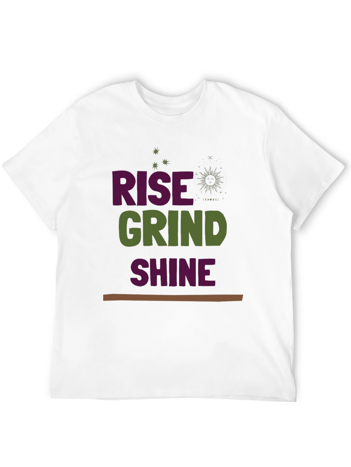 Elevate your everyday style with this motivational black t-shirt. Featuring the inspiring words "Rise Grind Shine" in bold purple and green lettering, this tee is designed to keep you focused on your goals. The shirt also has a brown line between the text, and a cool graphic of a sun. Made from a comfortable fabric, it offers a relaxed fit that's perfect for workouts, casual outings, or lounging at home. Show off your dedication and positive mindset with this eye-catching and versatile wardrobe essential. Available in various sizes.