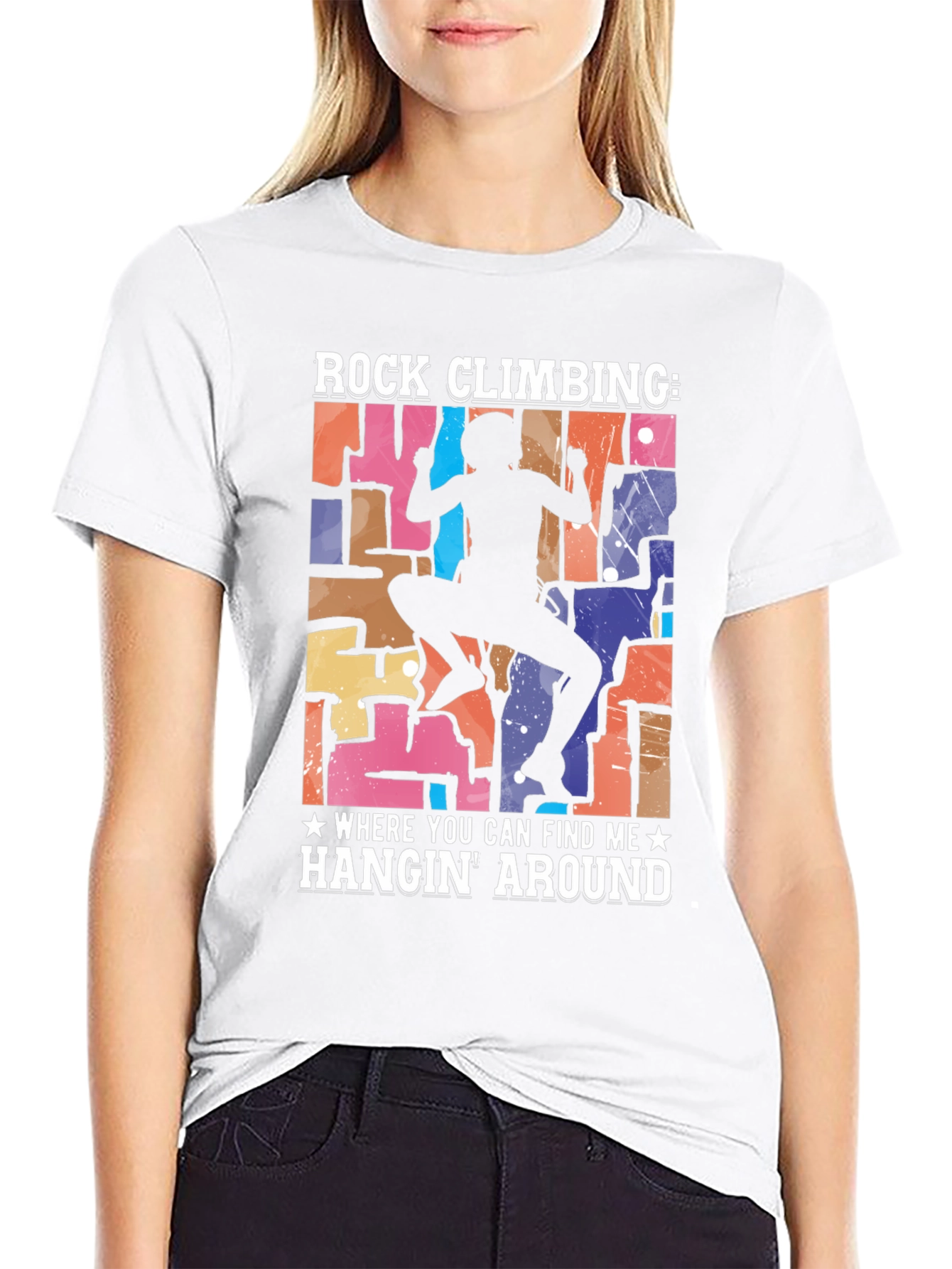 Show off your love for rock climbing with this stylish black t-shirt. The design features a silhouetted rock climber against a colorful, segmented climbing wall background. The text "ROCK CLIMBING" is printed above the climber, and "WHERE YOU CAN FIND ME HANGIN' AROUND" appears below, making it perfect for climbers with a sense of humor. This casual tee is ideal for wearing at the gym, outdoor climbing spots, or just around town to express your passion. The comfortable fit makes it a great choice for everyday wear.