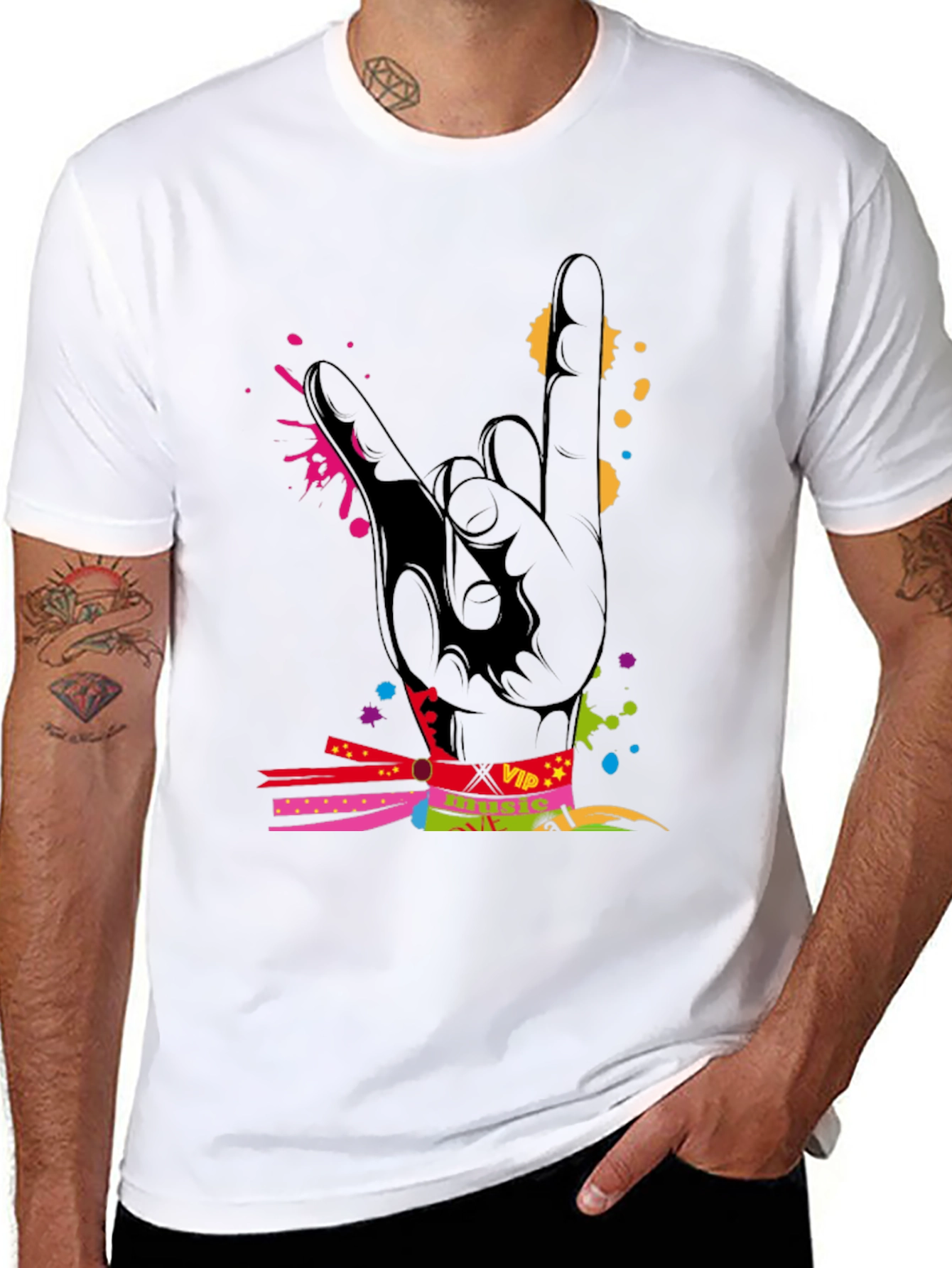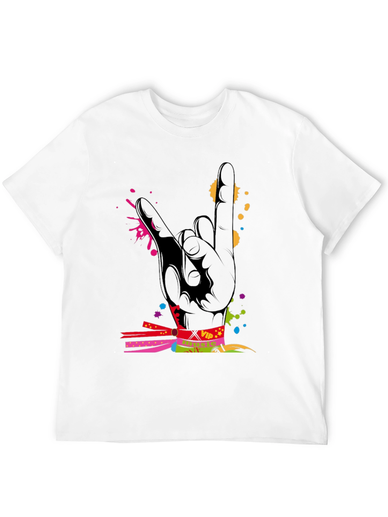 Show your love for rock music with this stylish black t-shirt. The design features a bold "rock on" hand gesture, artistically rendered with vibrant splashes of color. A VIP pass graphic adds an exclusive touch, suggesting a backstage or concert vibe. Made from a soft, breathable fabric, this t-shirt offers both comfort and style, perfect for concerts, casual outings, or expressing your musical passion. Grab yours today and rock on!