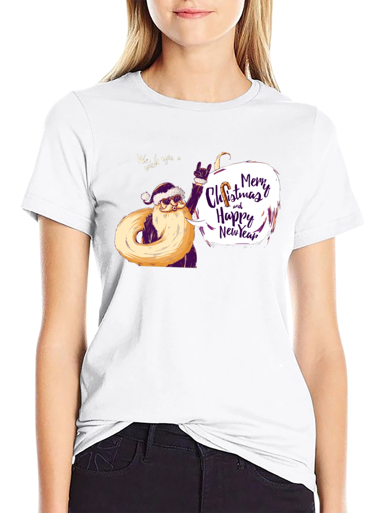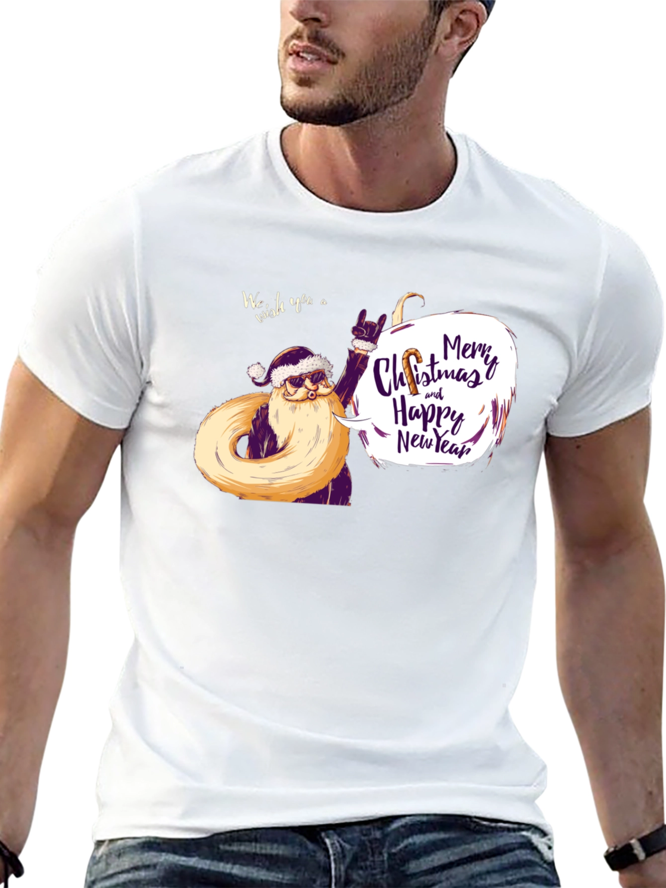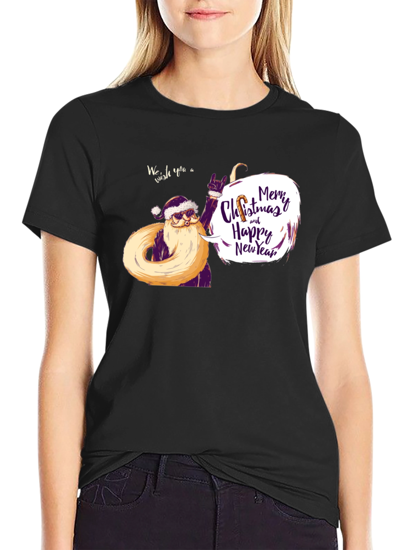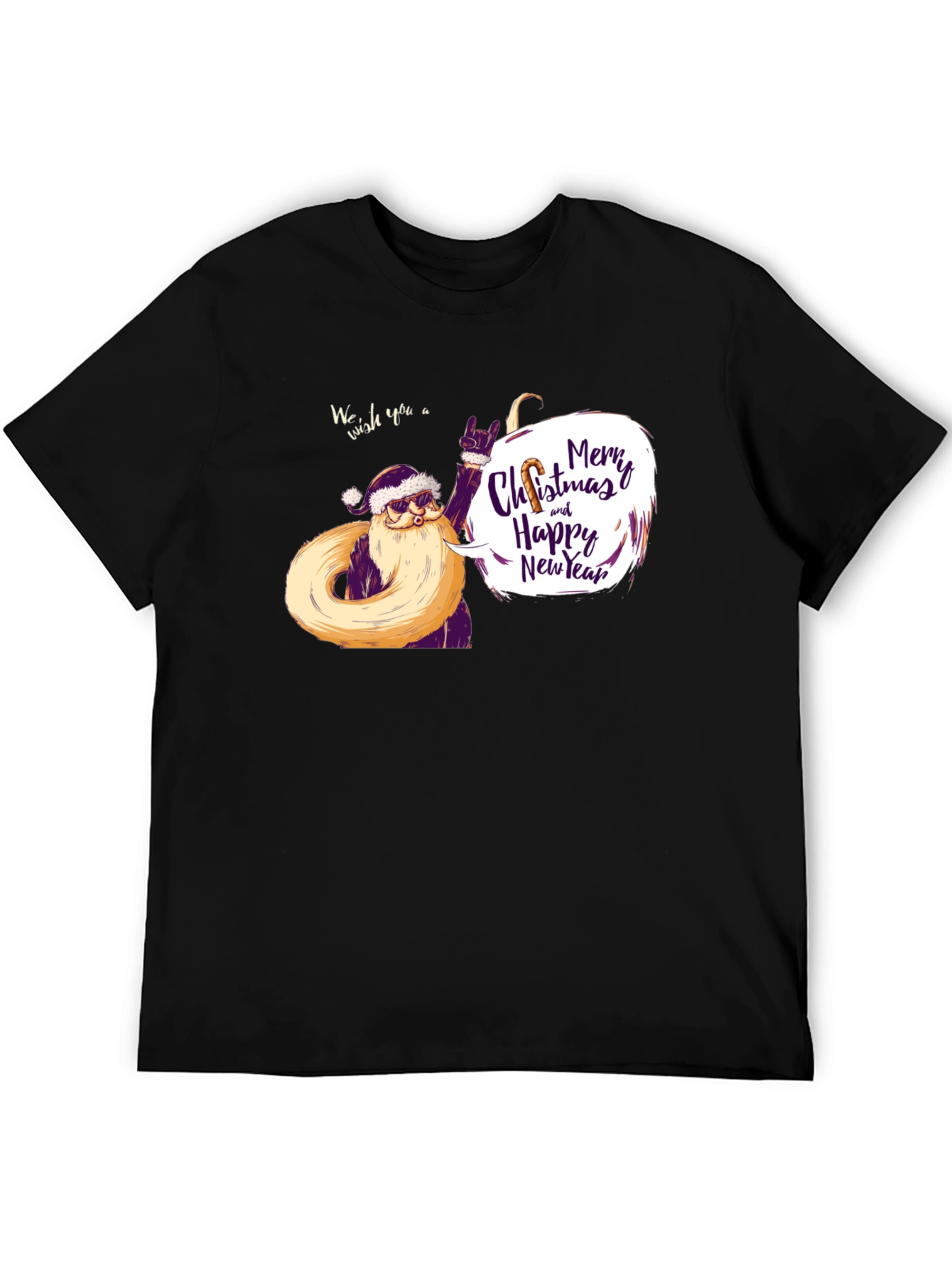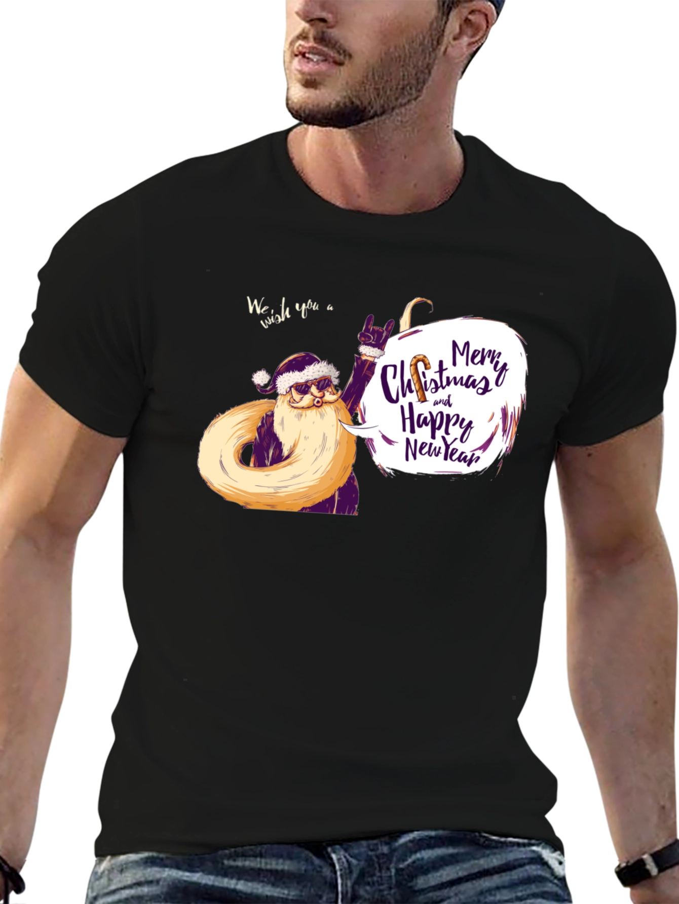 Get ready to rock around the Christmas tree with this unique black t-shirt! The shirt features a cool Santa Claus graphic with a long beard, sunglasses and hat, giving a rock and roll hand gesture. A talk bubble wishes "Merry Christmas and Happy New Year". Made from a comfortable material, this tee is perfect for holiday parties, casual wear, or as a fun Christmas gift. Show off your holiday spirit with a touch of rock and roll flair!