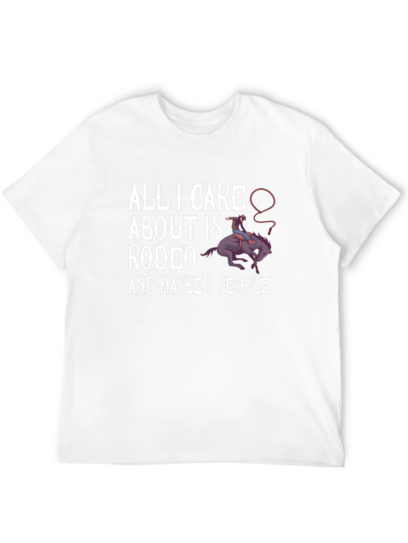 Show off your passion for rodeo with this eye-catching graphic t-shirt! Crafted from comfortable, breathable fabric, this black tee features a bold, white graphic print that reads "All I Care About Is Rodeo And Maybe 3 People," accompanied by an illustration of a cowboy riding a bucking bronco. This shirt makes a statement and is perfect for casual wear, rodeo events, or showing off your unique personality. Dress it up or down, this tee is a versatile addition to any wardrobe. Get yours today and let everyone know what you truly care about!