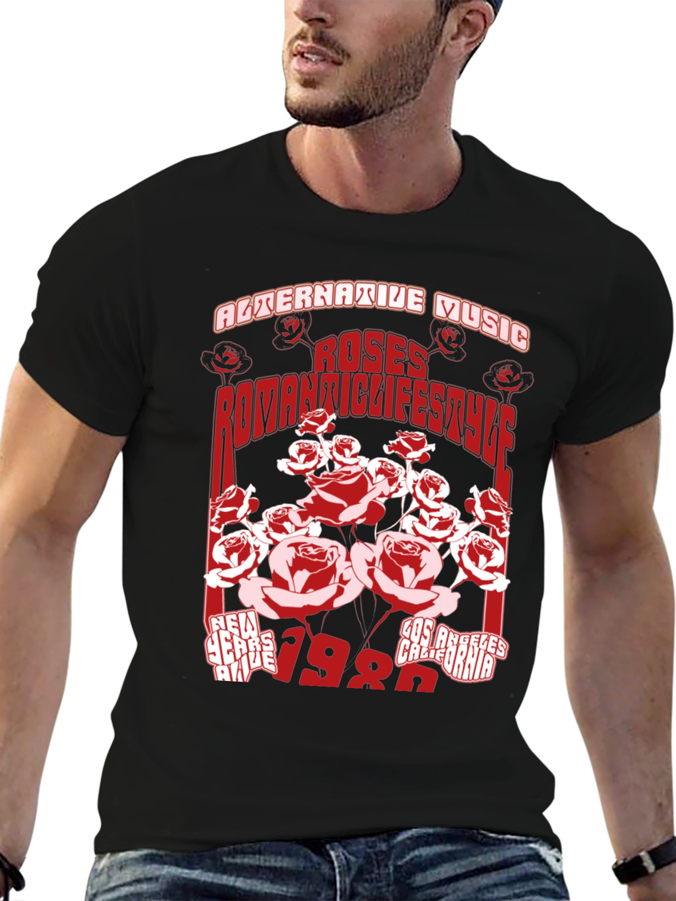 Elevate your casual style with this unique black graphic tee. Featuring a bold, red and white design that reads "Alternative Music, Roses, Romantic Lifestyle" along with floral rose illustrations. The shirt also says "New Years Eve 1982 Los Angeles California" making this a great choice for music and vintage enthusiasts. Made from comfortable fabric, it's perfect for everyday wear, concerts, or making a statement. Pair it with jeans or shorts for a relaxed, trendy look. A must-have addition to your wardrobe!
