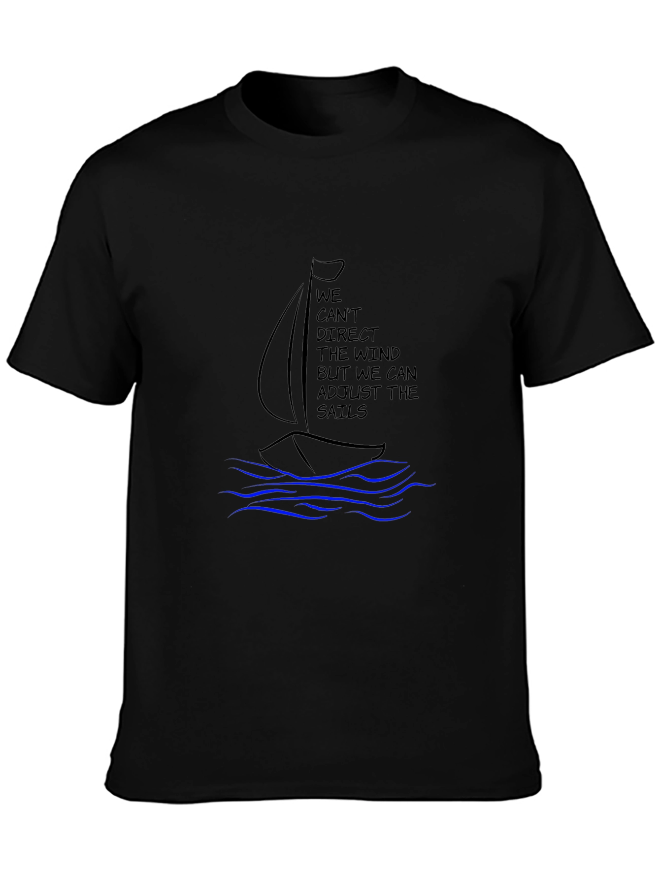 Embrace a positive outlook with this stylish black T-shirt featuring a unique sailing-themed graphic. The design showcases a simple sailboat illustration, gracefully sailing on blue waves, paired with the inspirational quote: "We can't direct the wind, but we can adjust the sails." Crafted from a soft, comfortable-looking fabric, this tee offers a relaxed fit perfect for everyday wear. Its classic crew neck and short sleeves make it a versatile addition to any wardrobe. Wear it casually with jeans or dress it up with a blazer for a modern, motivational look. This tee is a reminder to stay adaptable and resilient in the face of life's challenges.