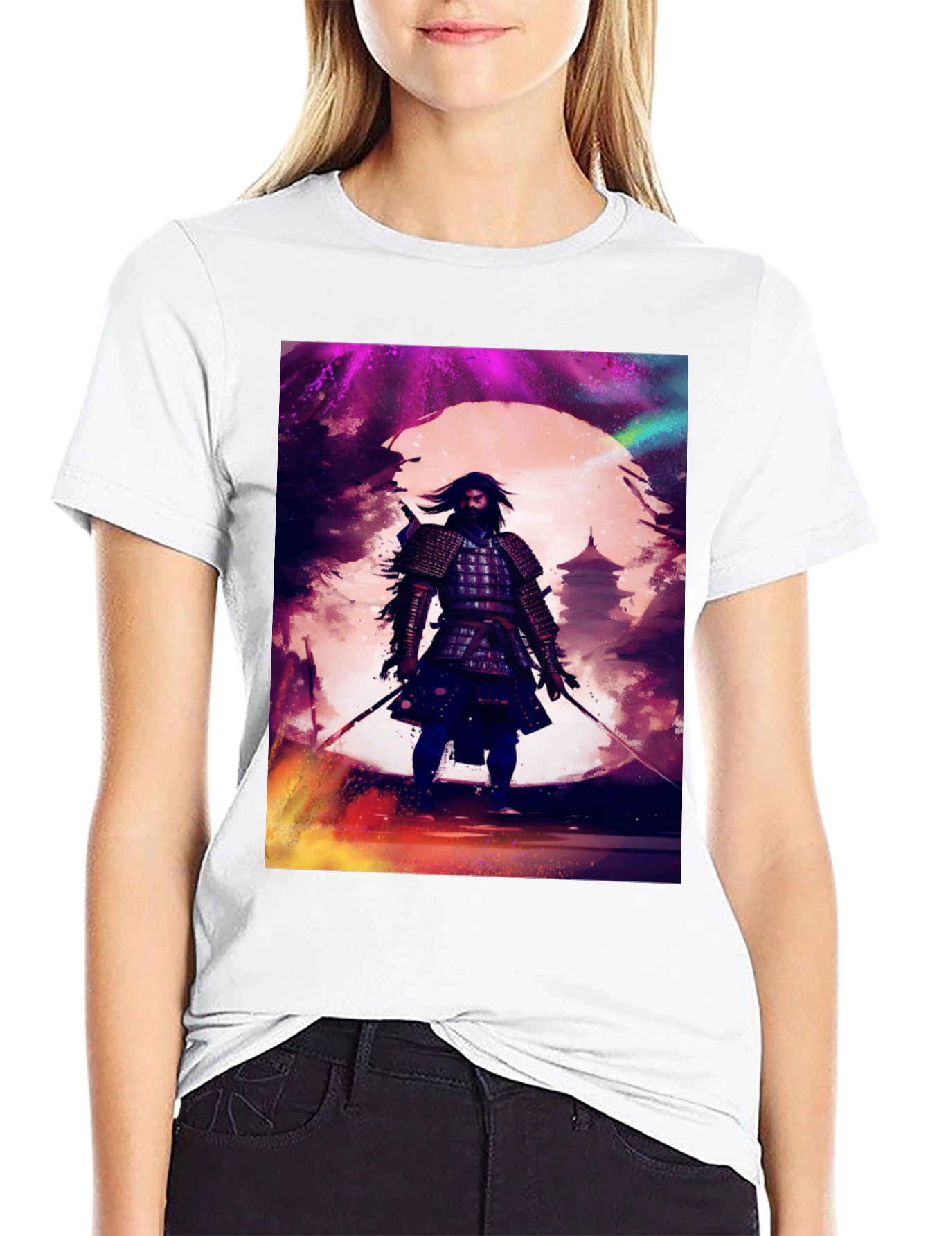 Showcase your love for Japanese art with this striking black t-shirt. The shirt features a bold graphic of a Samurai warrior against a vibrant, colorful backdrop with a temple in the distance. Made from comfortable cotton, this tee is perfect for everyday wear. The high-quality print ensures that the artwork remains vivid and eye-catching, wash after wash. Whether you're a fan of samurai culture, Japanese art, or unique graphic tees, this shirt is sure to turn heads. Pair it with your favorite jeans or shorts for a cool, casual look.