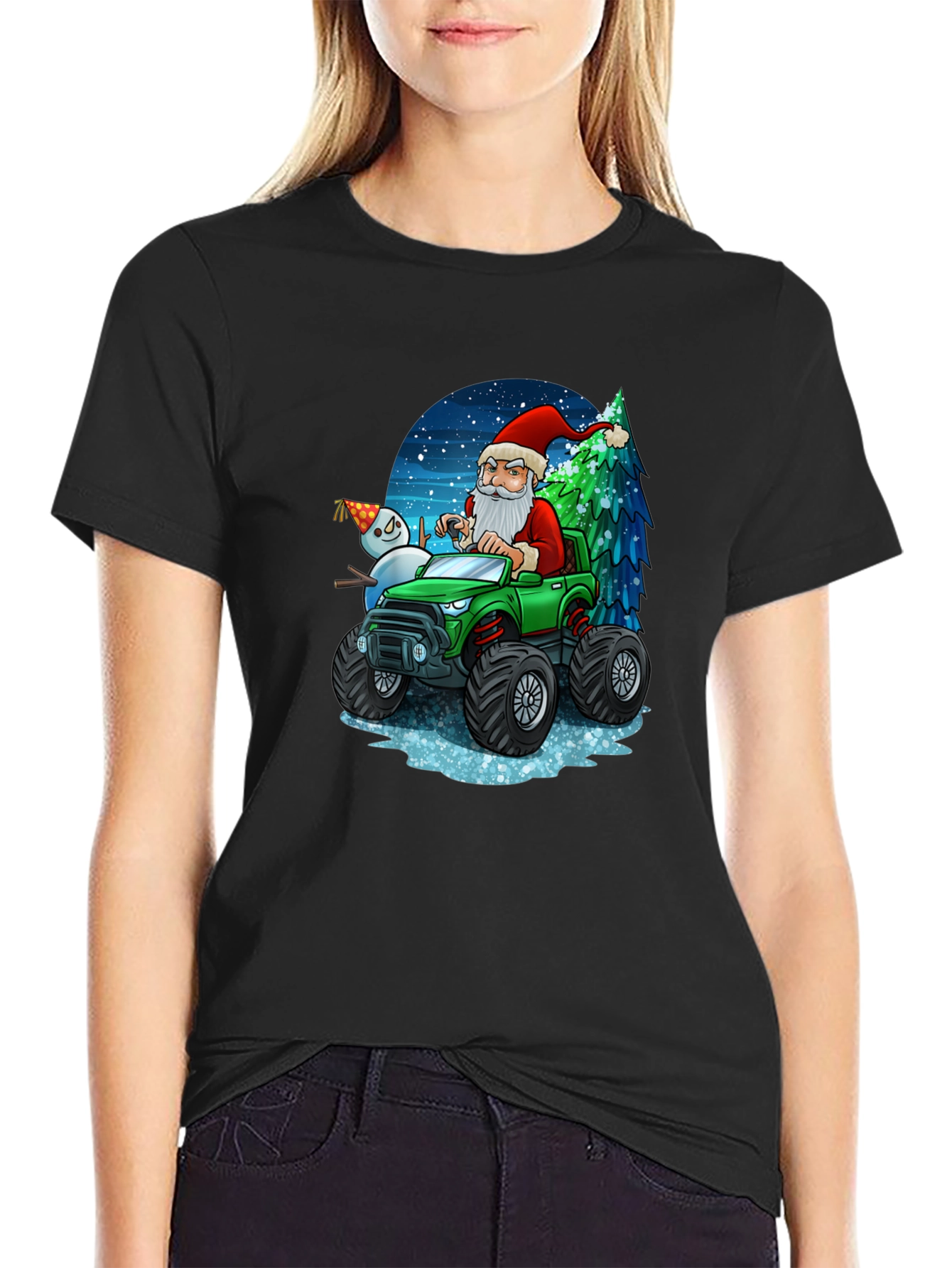 Get ready for the holidays with this fun Santa's Monster Truck T-shirt! The design features Santa Claus riding a green monster truck, complete with oversized tires and vibrant detailing. A snowman stands next to the truck with a festive Christmas tree in the background. Made from comfortable fabric, this shirt is perfect for spreading holiday cheer at parties, family gatherings, or casual outings. The unique and playful design is sure to turn heads and spark conversations. A great way to celebrate the Christmas season with a touch of automotive fun!