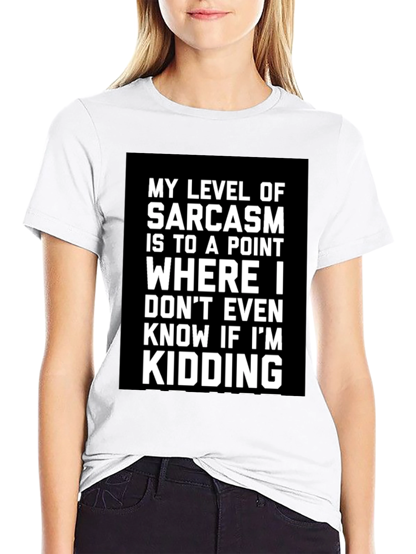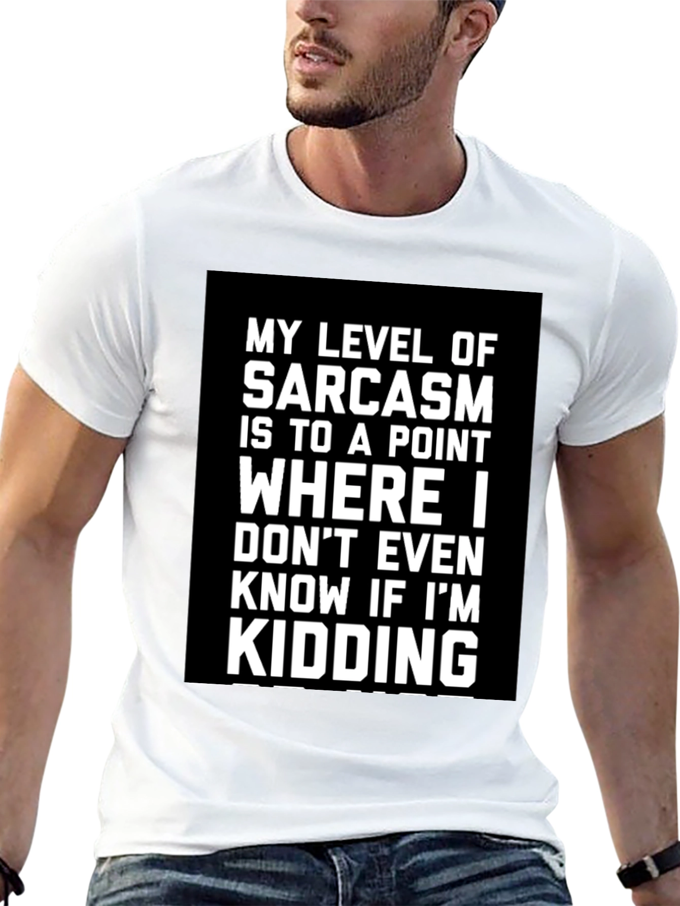 Embrace your witty side with this black graphic tee! The shirt features a bold white text design that reads "MY LEVEL OF SARCASM IS TO A POINT WHERE I DON'T EVEN KNOW IF I'M KIDDING." Made from comfortable fabric, this tee is perfect for casual wear and expressing your unique sense of humor. The design is eye-catching and conversation-starting, ensuring you'll stand out. It's an ideal gift for friends and family. Pair it with jeans for a relaxed weekend outfit or dress it up with a jacket for a night out. A must-have addition to any wardrobe!