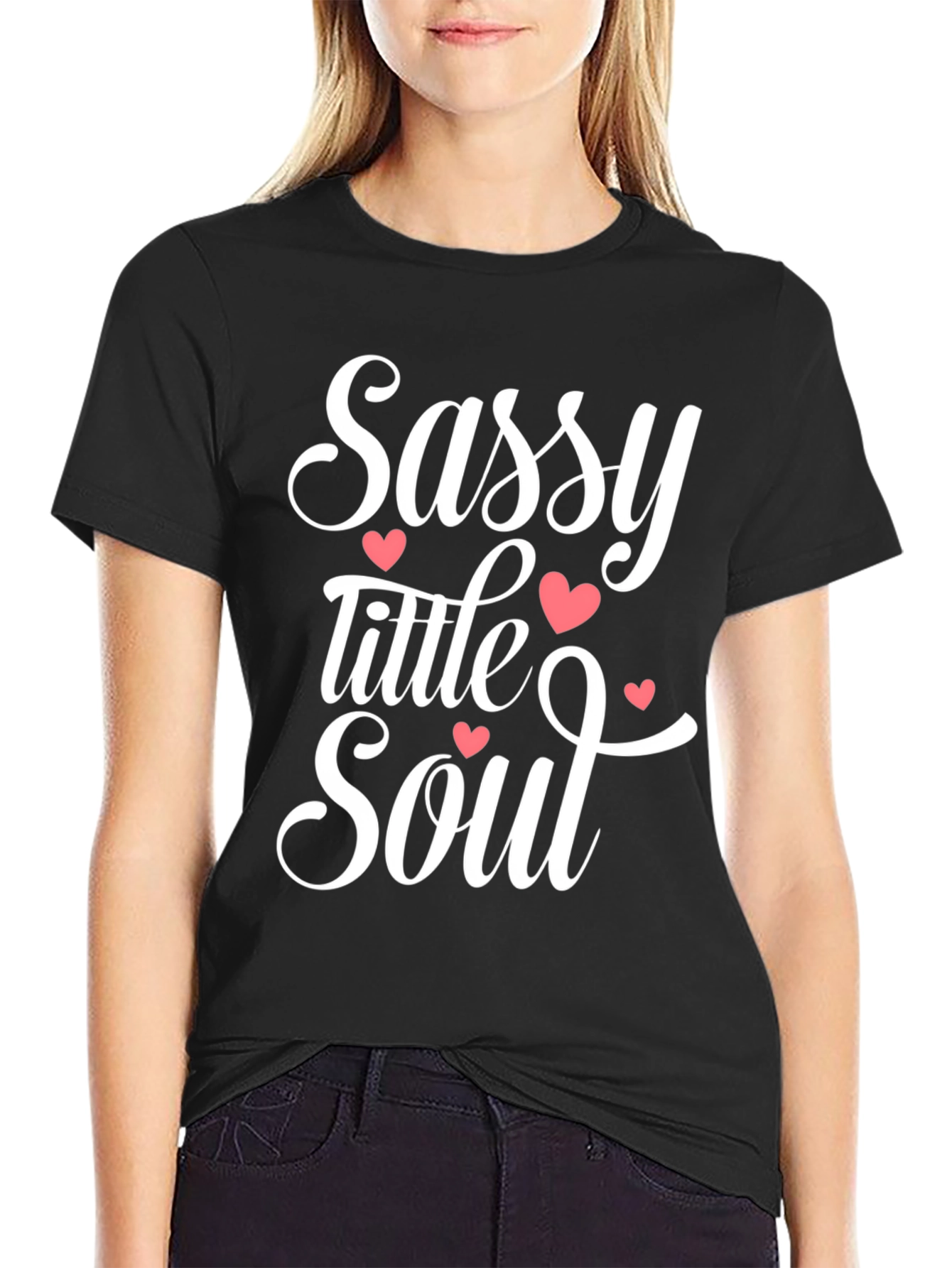 This classic black t-shirt features a charming and playful design. The white text, "Sassy little Soul", is written in a whimsical cursive font and accented with small pink hearts for a touch of sweetness. Made from a soft, breathable fabric, this tee is comfortable enough for all-day wear. Its versatile style makes it perfect for casual outings, layering under jackets, or even lounging at home. Express your personality and add a touch of fun to your wardrobe with this trendy graphic tee. A great gift for someone with a sassy and sweet side!