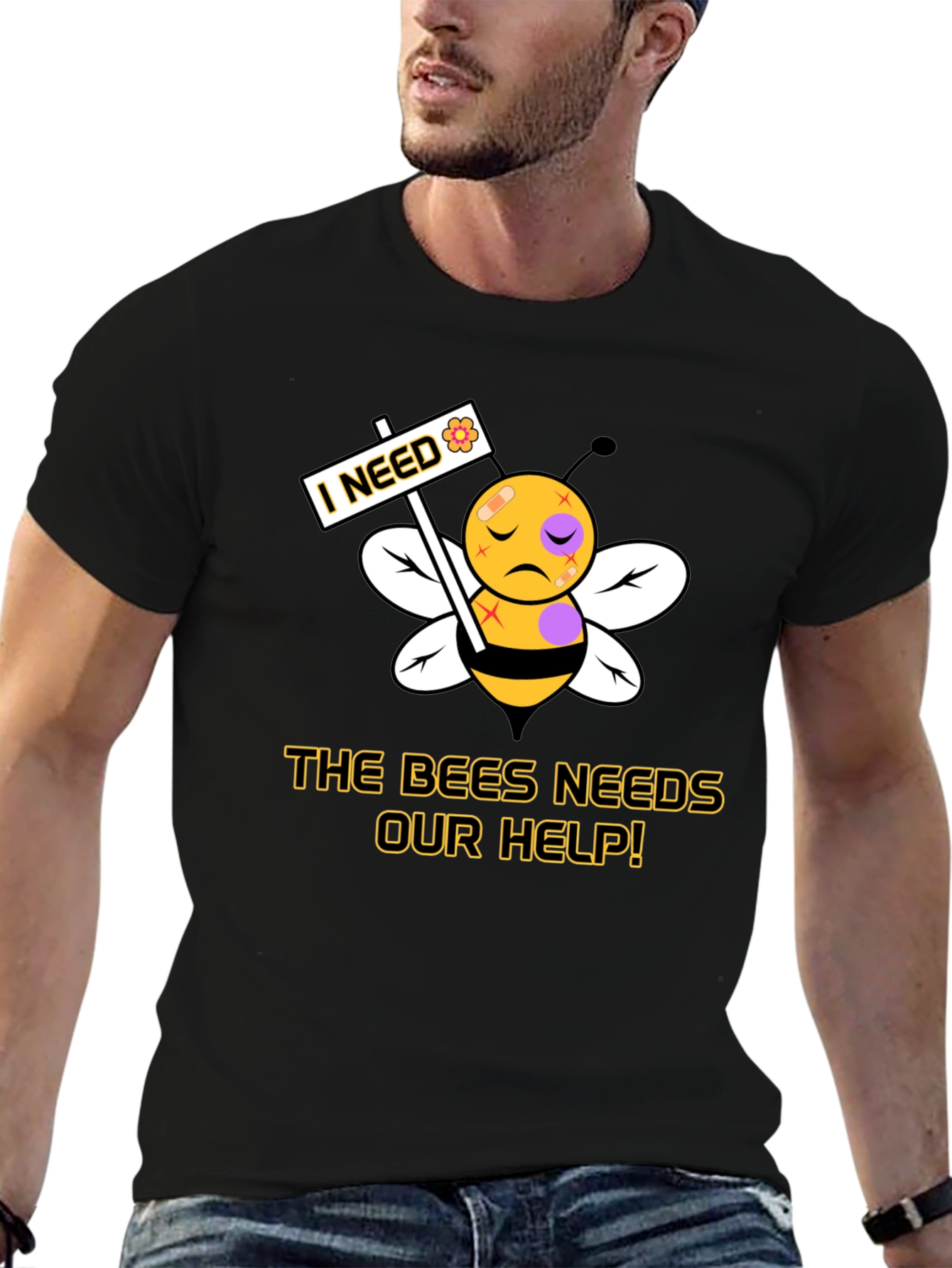 Show your support for bees with this black graphic t-shirt. The design features a sad bee with bandages, holding a sign that reads "I NEED" with a flower symbol. The text "THE BEES NEEDS OUR HELP!" is prominently displayed. This eye-catching shirt is perfect for raising awareness and expressing your passion for environmental conservation. Made from comfortable materials, it's ideal for everyday wear, activism events, or as a thoughtful gift for bee lovers and nature enthusiasts. Join the movement to protect these vital pollinators in style!