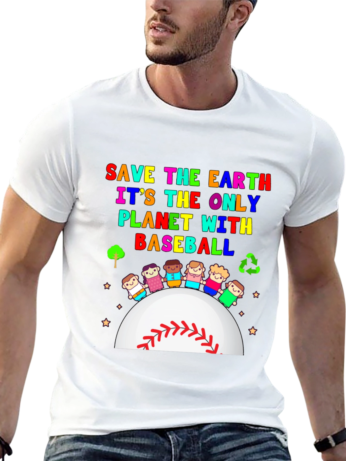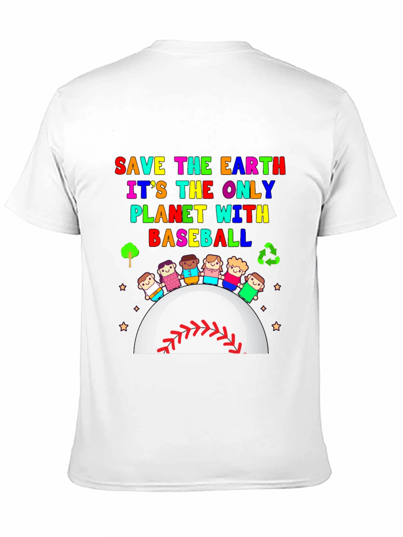 Show your love for the planet with this fun graphic t-shirt. Featuring a colorful design with the message "Save the Earth, It's the only planet with baseball," this tee is perfect for eco-conscious baseball fans. The design includes adorable kid characters, a recycling symbol, and a partial baseball image. Made from a soft, comfortable fabric, this black tee is ideal for casual wear, sports events, or environmental awareness activities. Let everyone know you are passionate about preserving our planet in style with this unique T-shirt. Get yours today and make a statement!