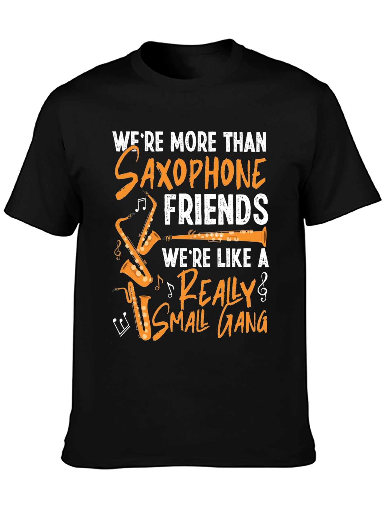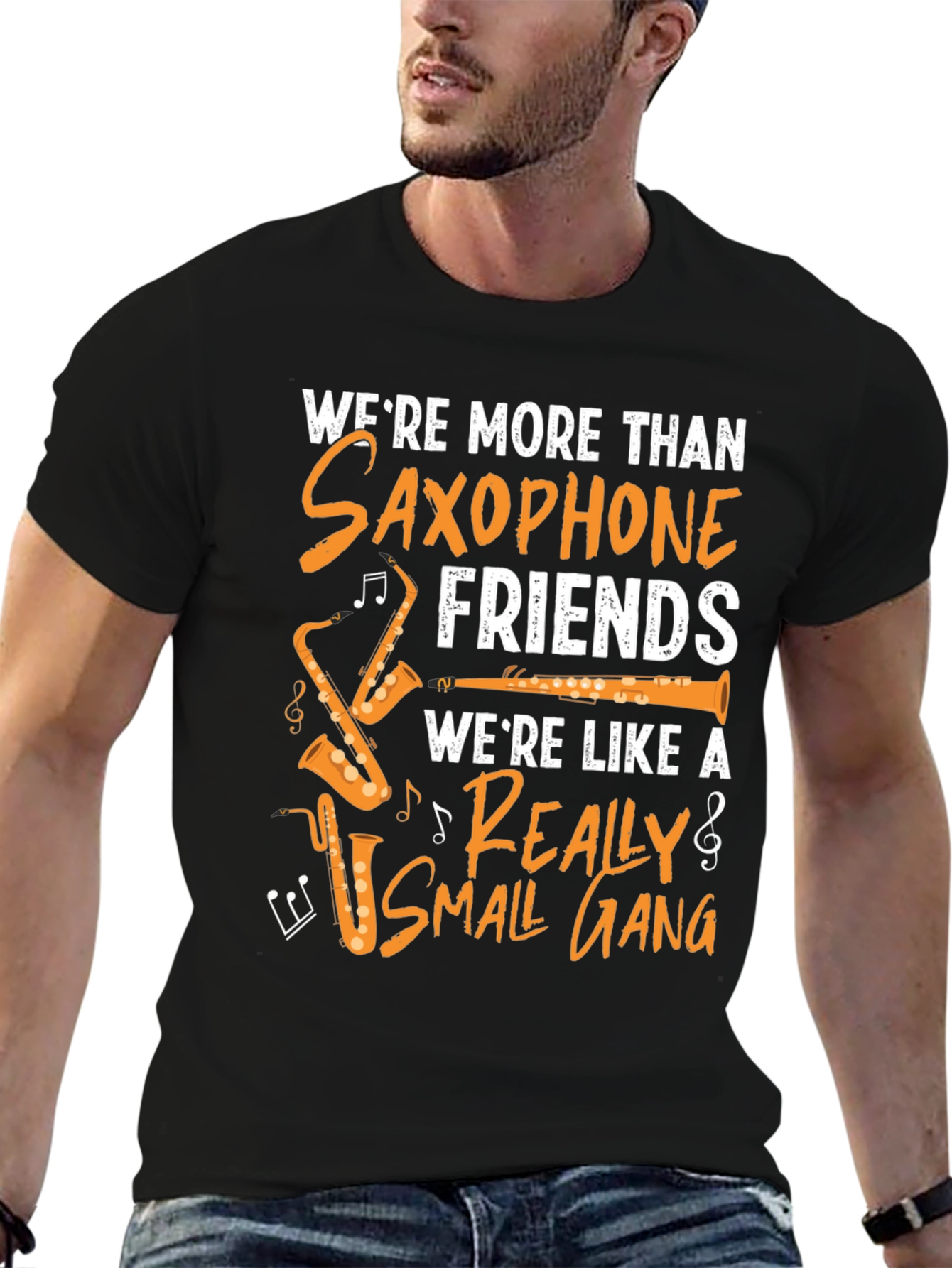 Show off your love for saxophones and camaraderie with this unique black t-shirt. Featuring a playful design with vibrant orange graphics, it declares, "We're More Than Saxophone Friends, We're Like A Really Small Gang." The design incorporates saxophone imagery and musical notes. Made from a comfortable fabric blend, this tee is perfect for casual wear, music events, band practice, or as a fun gift for the saxophone enthusiast in your life. The classic fit ensures it's a great addition to any wardrobe. Express your passion and sense of humor with this eye-catching tee!