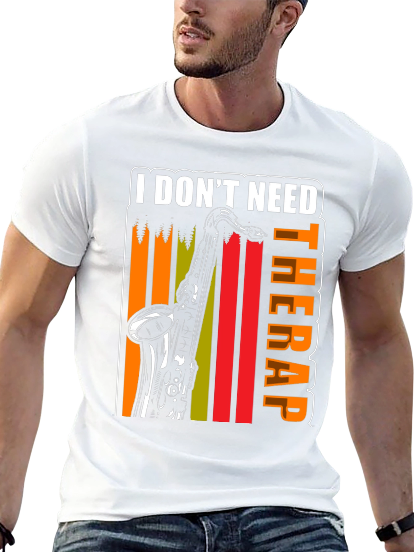 Show off your passion with this unique Saxophone Therapy T-Shirt. The design features a stylish saxophone graphic set against a retro-inspired background, alongside the phrase 'I DON'T NEED THERAPY'. The bold graphic is printed on a soft, comfortable black fabric, perfect for everyday wear. This tee is a great conversation starter and makes an ideal gift for musicians, saxophone players, music lovers, or anyone who appreciates a good laugh. Express your love for music and add some fun to your wardrobe with this eye-catching t-shirt. Perfect for casual outings, band practice, or relaxing at home.