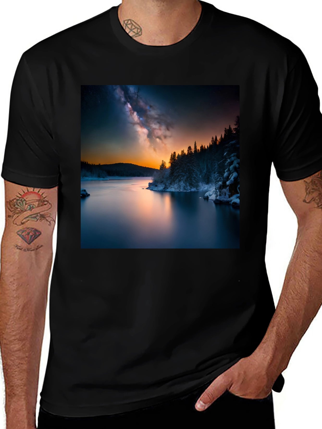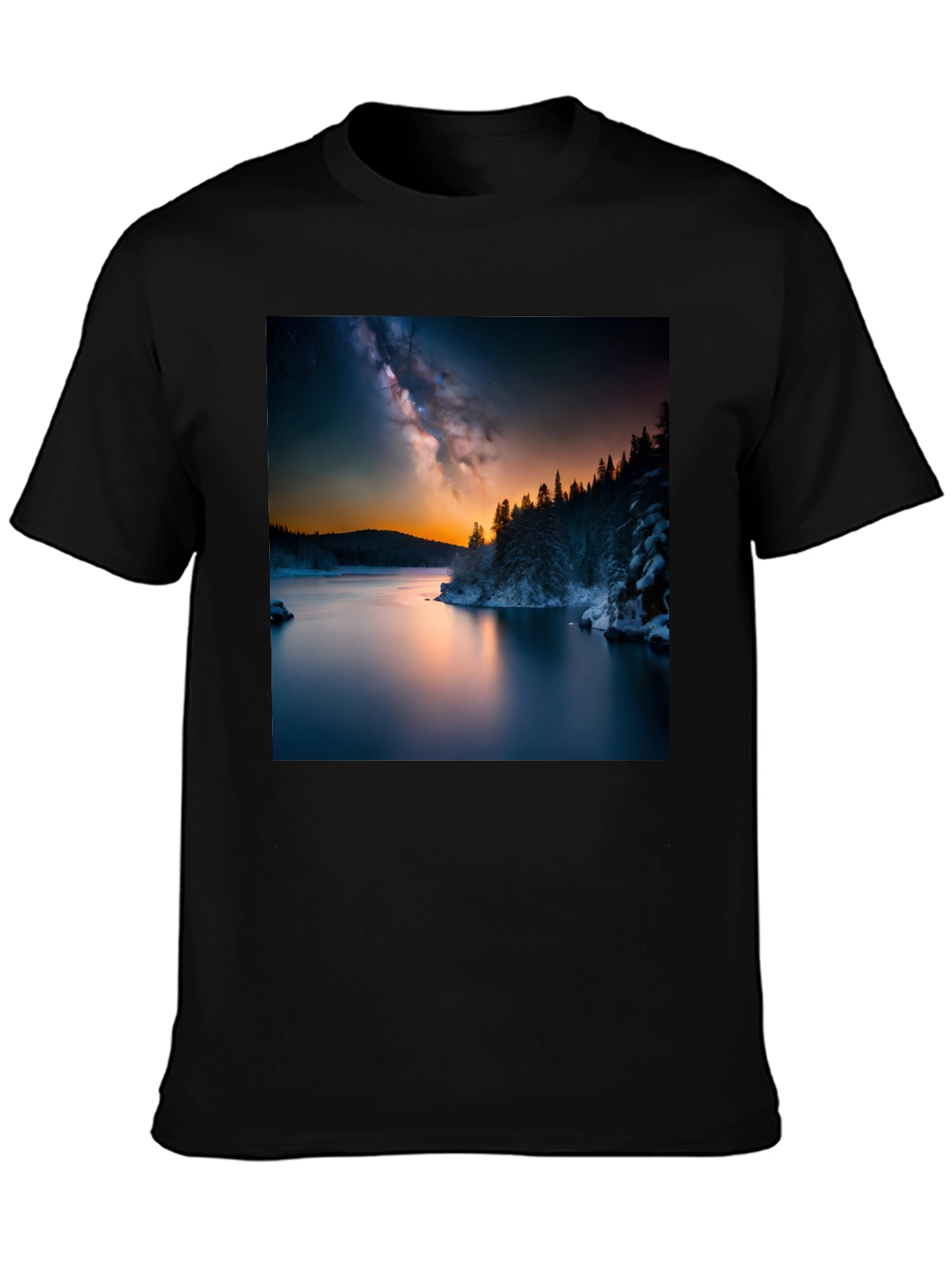 Embrace the beauty of nature with this captivating graphic tee. The shirt features a stunning image of a serene lake mirroring a vibrant galaxy sky. Towering trees line the water's edge, creating a peaceful yet dramatic landscape. The design is printed on a soft, comfortable black fabric that ensures all-day wearability. Perfect for casual outings, nature lovers, or anyone who appreciates unique and artistic apparel, this tee is a statement piece that combines comfort and style. Elevate your wardrobe with this eye-catching shirt that will spark conversations and turn heads.