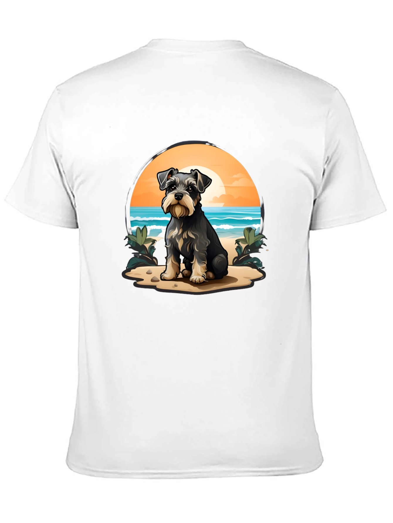 Show off your love for Schnauzers with this unique t-shirt! The design features a charming Schnauzer dog sitting on a sandy beach against a backdrop of a beautiful sunset and ocean waves. Made from comfortable, breathable fabric, this black t-shirt is perfect for everyday wear. The vibrant colors and detailed illustration make it a standout piece. Whether you're a dog lover or just appreciate eye-catching designs, this tee is a must-have. Ideal for casual outings, dog walks, or lounging at home. Grab yours now and let your style shine!