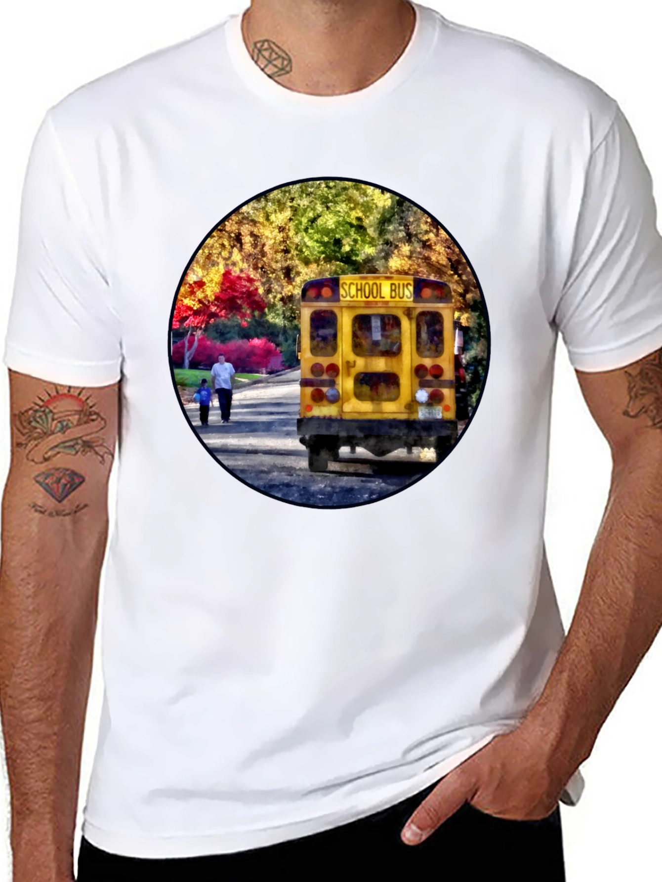 Show off your love for school days with this unique graphic tee! This black t-shirt features a vibrant, circular design showcasing the back of a classic yellow school bus on a colorful autumn road. In the distance, a parent walks with their child, adding to the nostalgic charm. Made from comfortable, breathable fabric, this tee is perfect for casual wear, back-to-school events, or as a gift for teachers and bus drivers. Pair it with jeans or shorts for a relaxed, everyday look. Add a touch of whimsy to your wardrobe with this eye-catching school bus tee!