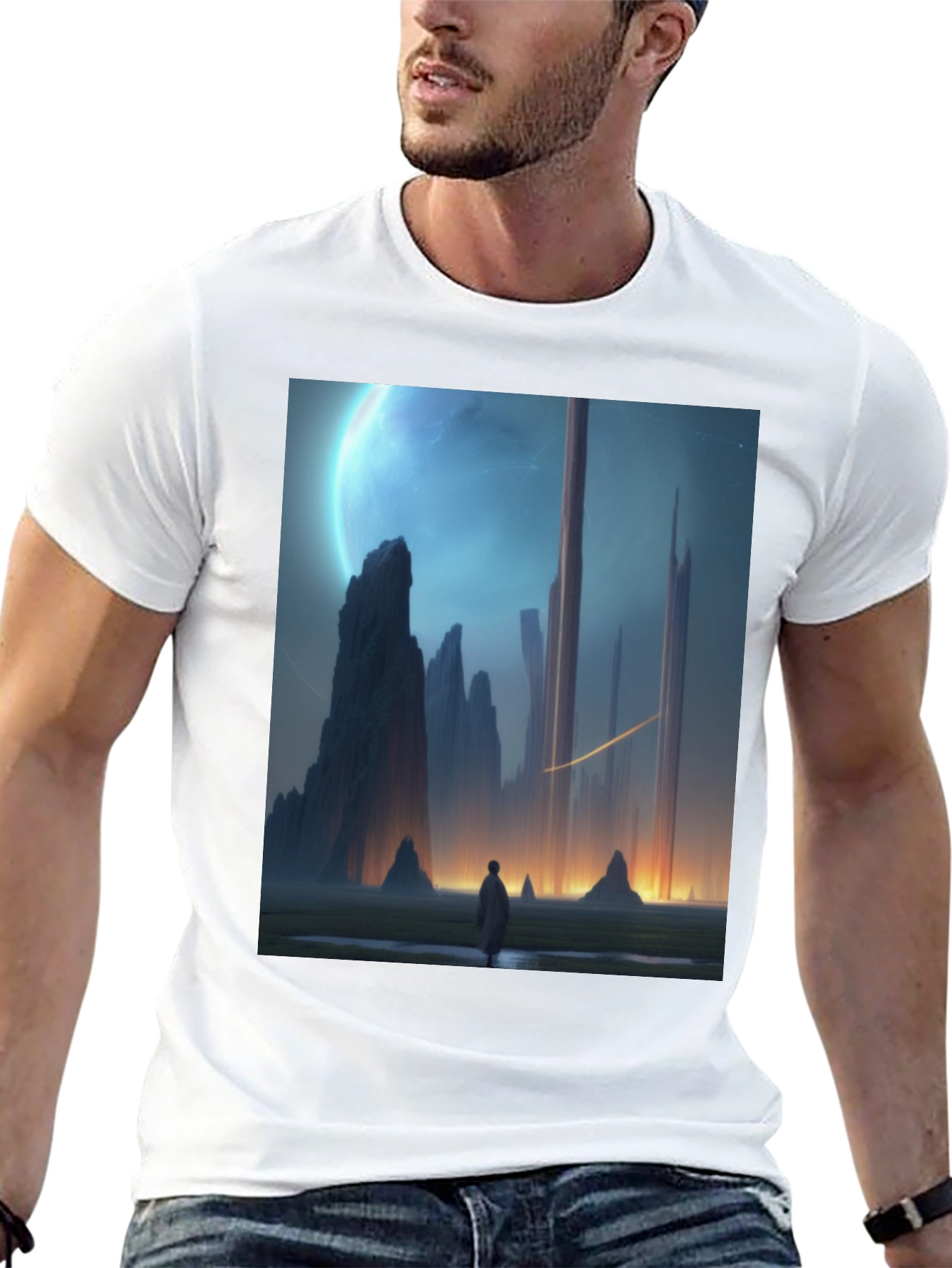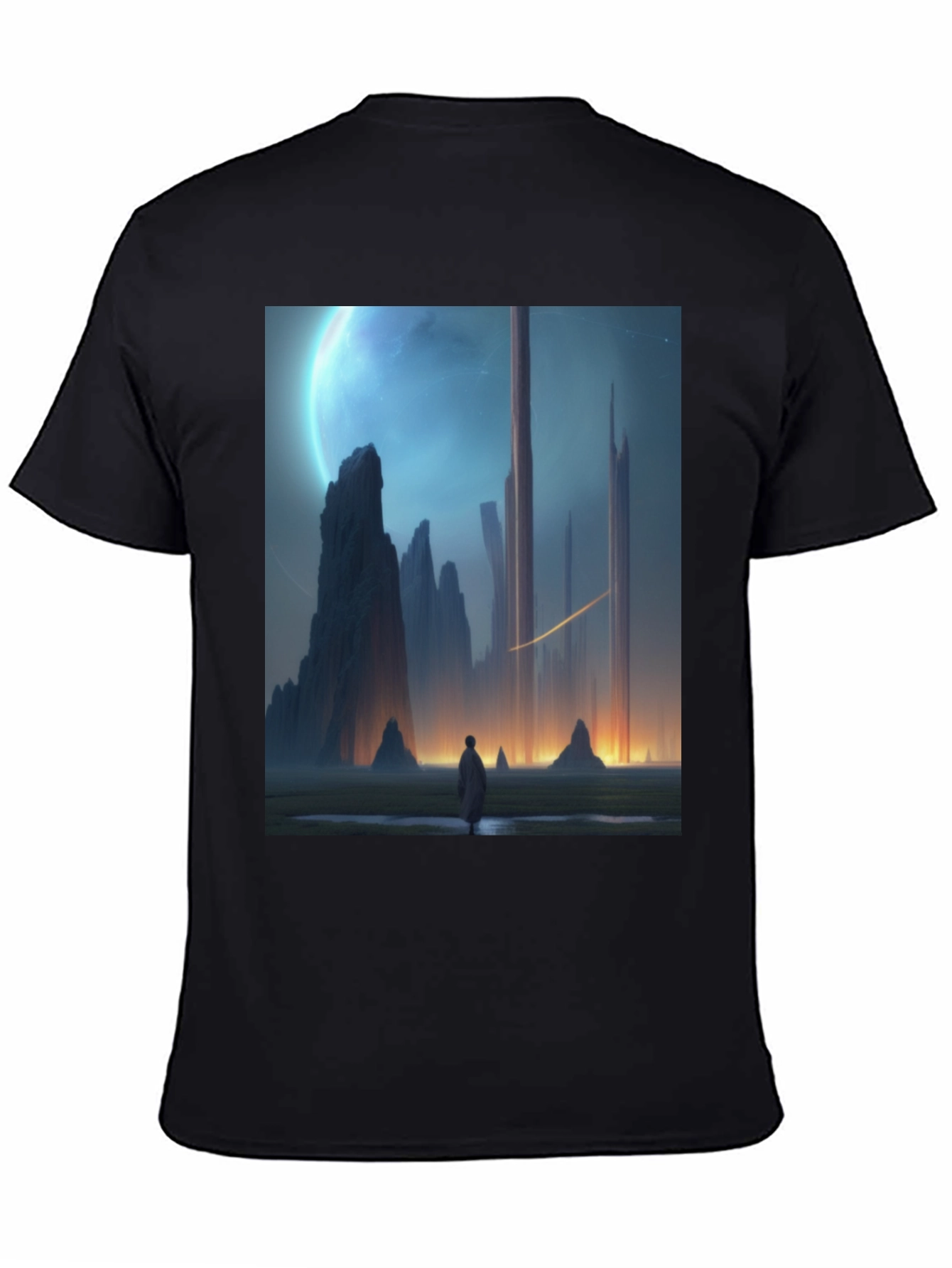 Explore the cosmos with this unique graphic tee! Featuring a mesmerizing sci-fi landscape with towering structures, a distant figure, and a luminous celestial body, this black t-shirt is a wearable piece of art. Crafted from comfortable, breathable fabric, it's perfect for everyday wear, casual outings, or making a statement at your next sci-fi convention. The vivid print showcases a world beyond our own, inspiring curiosity and imagination. Elevate your wardrobe with this conversation-starting t-shirt and let your style reflect your love for the unknown. Get yours today!