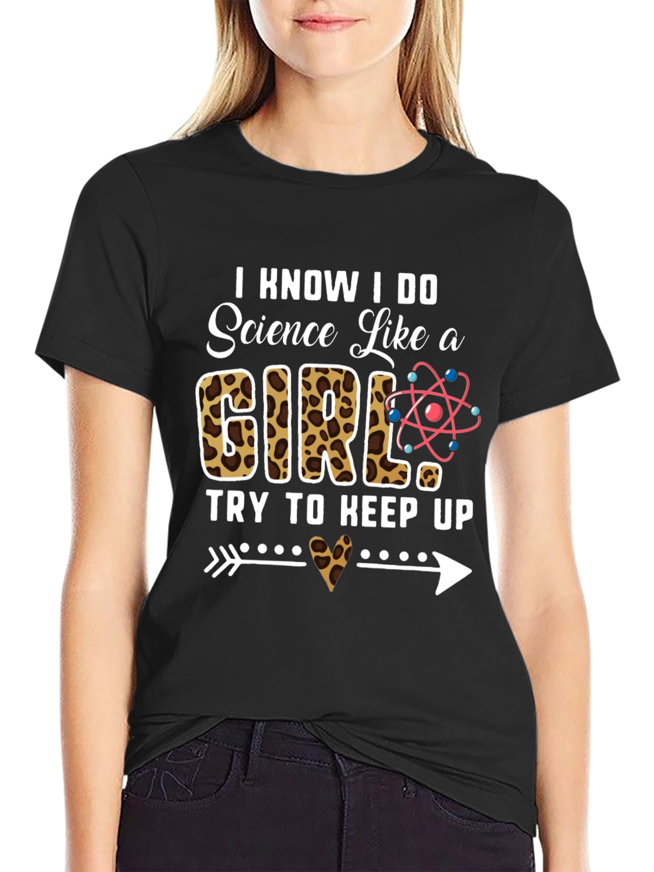 Show off your love for science with this eye-catching t-shirt. Featuring the bold statement "I KNOW I DO Science Like a GIRL. TRY TO KEEP UP," this tee is perfect for any female scientist, student, or STEM enthusiast. The word "GIRL" is uniquely designed with a stylish leopard print pattern that makes the design pop. An atom symbol adds a scientific touch. Crafted from comfortable fabric and designed for everyday wear, this shirt is ideal for classrooms, labs, or casual outings. Make a statement and inspire others with this empowering tee!