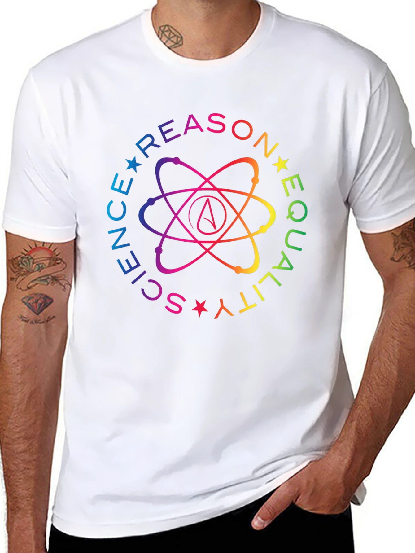 Show your support for science, reason, and equality with this eye-catching black t-shirt. The design features a vibrant, rainbow-colored graphic with the words "SCIENCE, REASON, EQUALITY" arranged in a circular pattern with stars. At the center is a stylish atom symbol with the "A" logo. Made from comfortable fabric, this tee is perfect for everyday wear, rallies, or simply expressing your views. Stand out from the crowd and spark meaningful conversations with this unique and thought-provoking t-shirt.