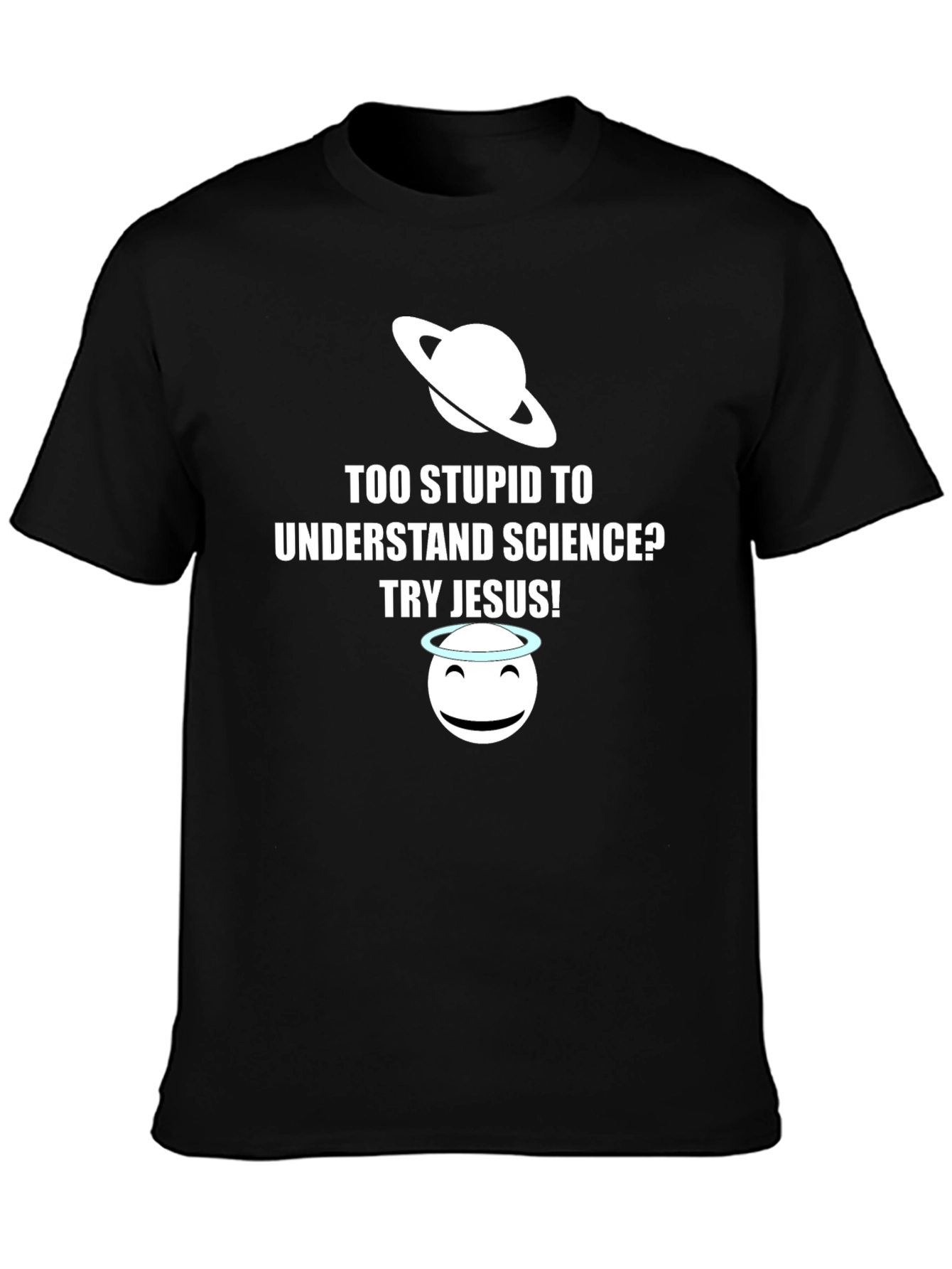 Embrace humor and spark conversations with this unique graphic tee. This black t-shirt features a playful design, showcasing a planet icon followed by the witty phrase "TOO STUPID TO UNDERSTAND SCIENCE? TRY JESUS!" accompanied by a smiling face with a halo. The message is printed in bold, white font. Made from a soft, comfortable fabric, this tee offers a relaxed fit and is perfect for casual wear, science enthusiasts, or anyone with a lighthearted approach to life's big questions. Wear it to school, social gatherings, or just lounging around. This t-shirt is sure to turn heads and bring a smile to everyone's face.