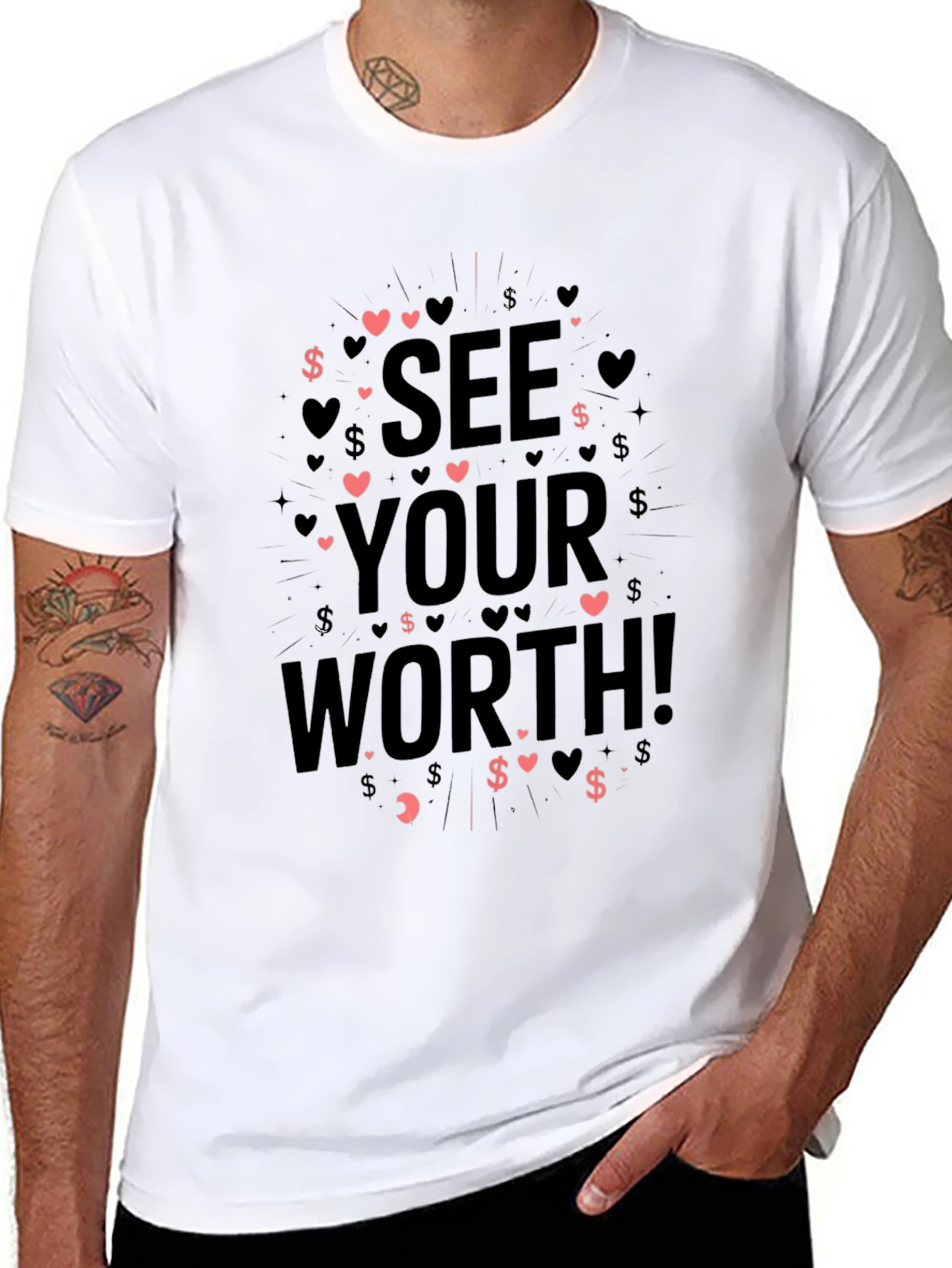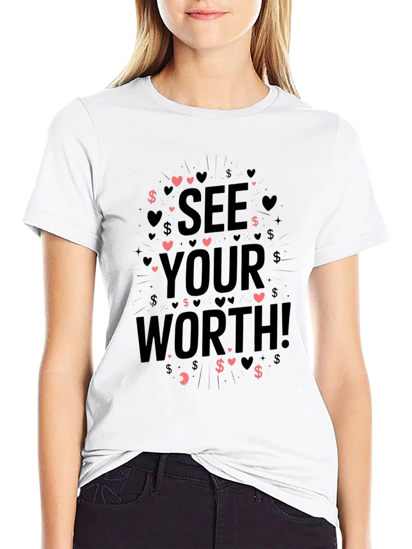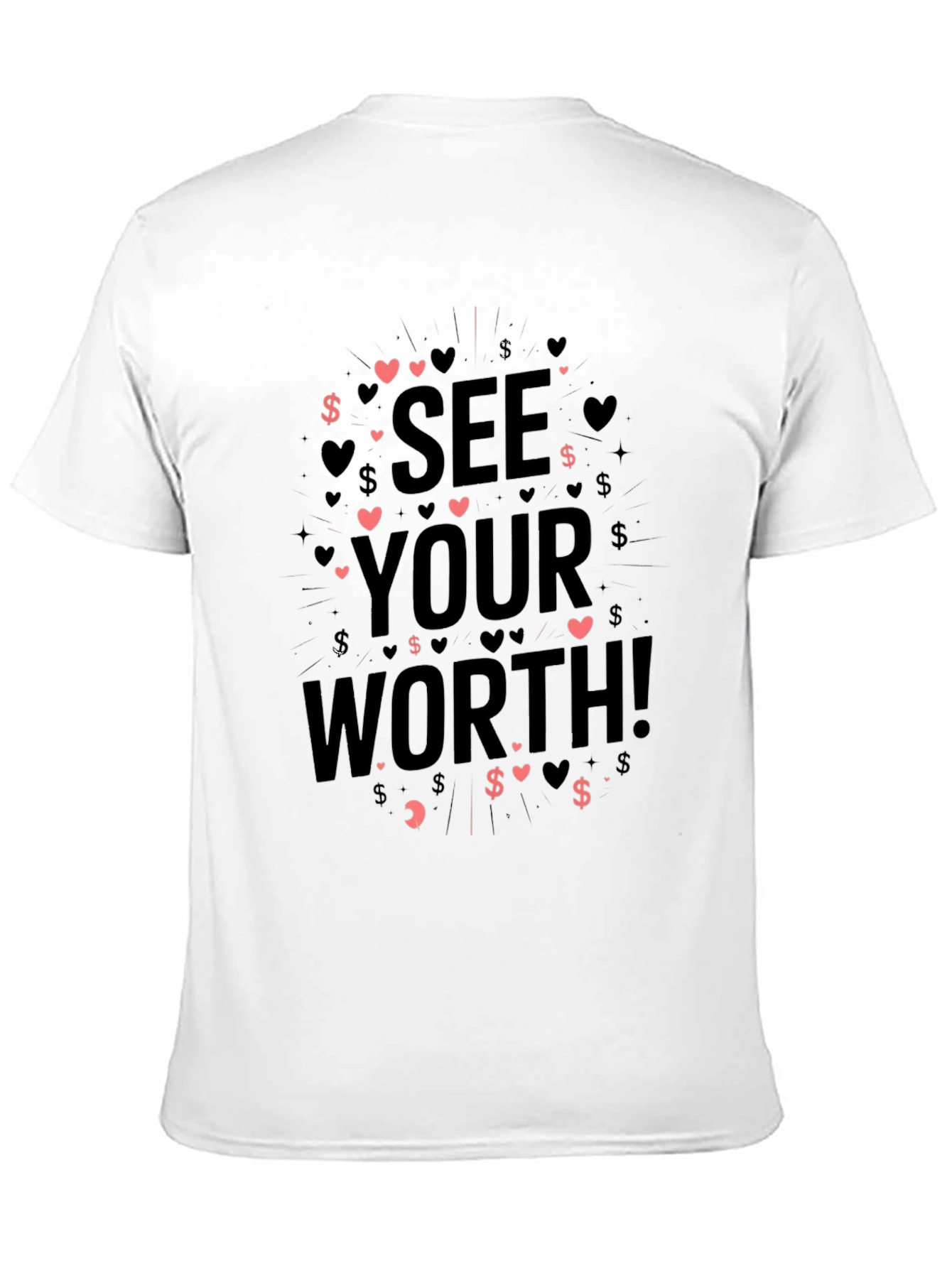 Elevate your style with this inspiring black graphic t-shirt. Featuring the powerful message "See Your Worth!" surrounded by heart and dollar sign accents, this tee is a statement piece. The design is printed on a soft, breathable fabric, making it comfortable for all-day wear. Perfect for casual outings, motivational events, or simply expressing your self-love, this tee combines comfort with a bold message. Show the world your confidence and style with this unique and empowering piece. A must-have addition to any wardrobe, this tee is more than just clothing—it's a reminder of your inherent value.