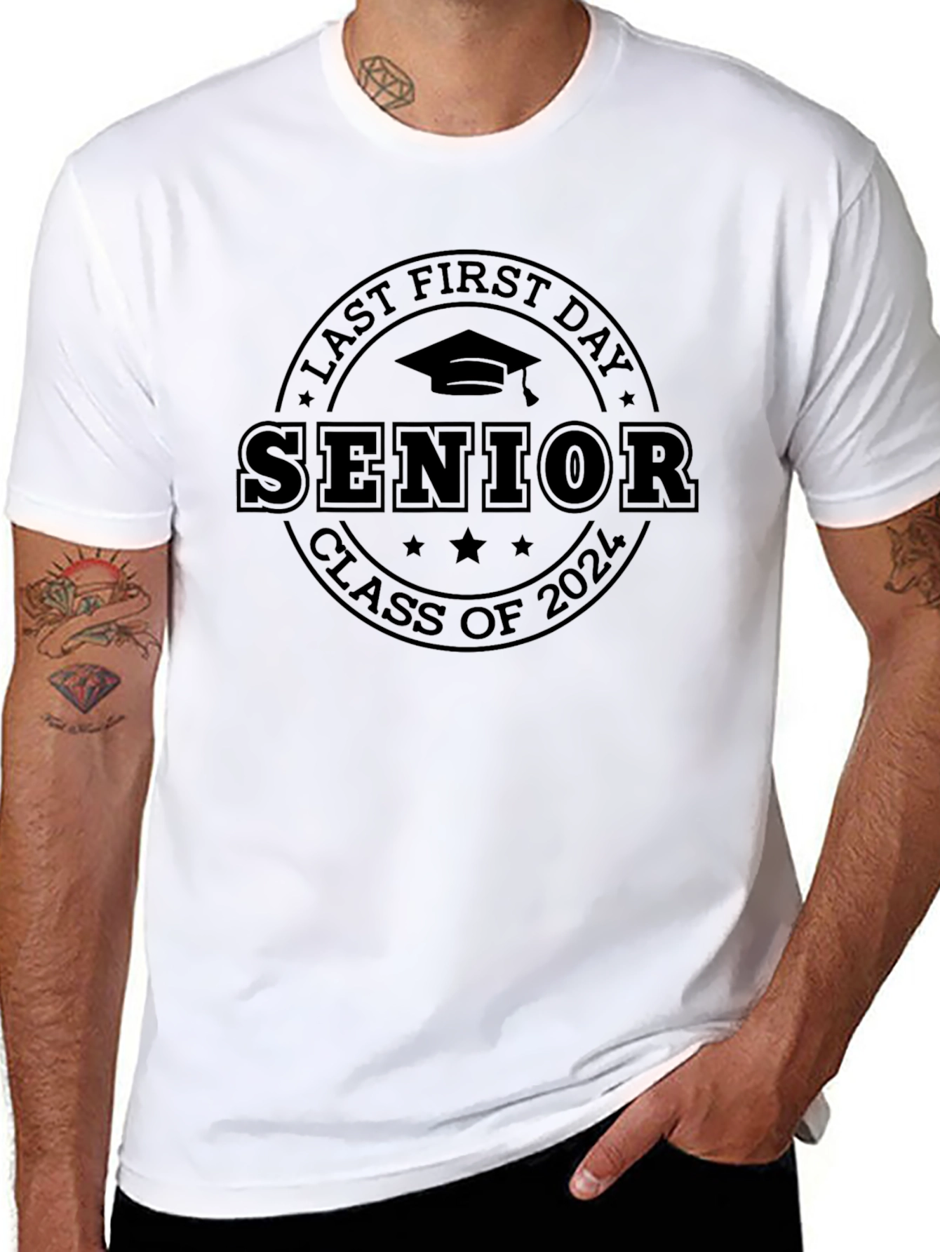 Show your senior status with this black t-shirt featuring a "Senior Class of 2024" design. The shirt showcases the text "Last First Day", with a graduation cap, stars, and the word "Senior" prominently displayed. Ideal for students celebrating their final year, this shirt is a comfortable and stylish way to commemorate this milestone. The design makes it perfect for graduation events, school gatherings, or everyday wear. Get yours now and celebrate your senior year in style!