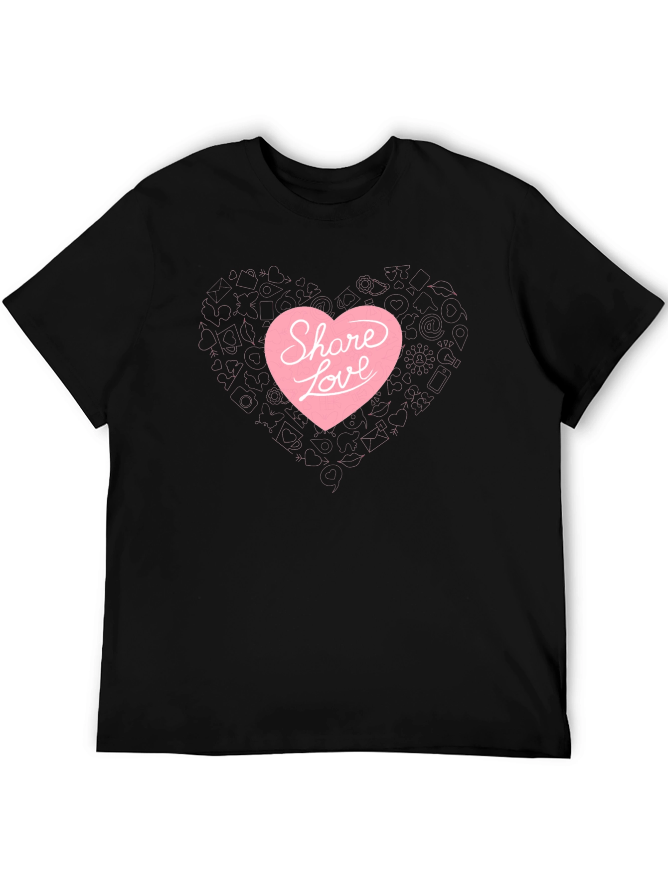 Spread the love with this stylish black graphic tee. This shirt features a unique heart design made up of smaller love-themed icons, with a bold, pink heart center displaying the message "Share Love". Crafted from a comfortable, soft-touch fabric, this tee offers a relaxed fit, perfect for everyday wear. The shirt features short sleeves and a classic crew neck design. Whether you're heading out for a casual day or want to make a statement, this t-shirt is a great way to express positivity and spread some love.