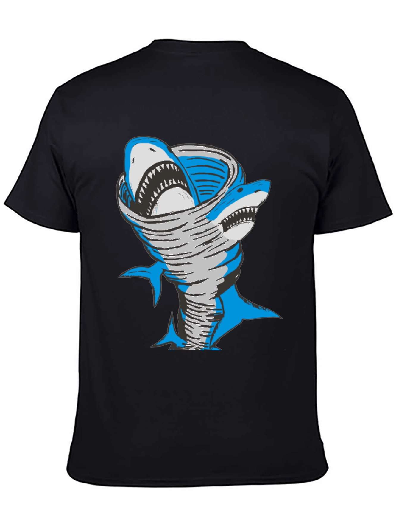 Make a splash with this unique Sharknado graphic tee! This eye-catching black t-shirt features a creatively designed graphic of sharks swirling within a tornado. The design boasts shades of blue, white, and gray creating a dynamic and attention-grabbing visual. Made from what appears to be soft, breathable cotton or a cotton blend, this tee promises both style and comfort. Perfect for casual wear, a day at the beach, or as a conversation starter at social gatherings. Show off your playful side and love for the ocean with this one-of-a-kind tee.