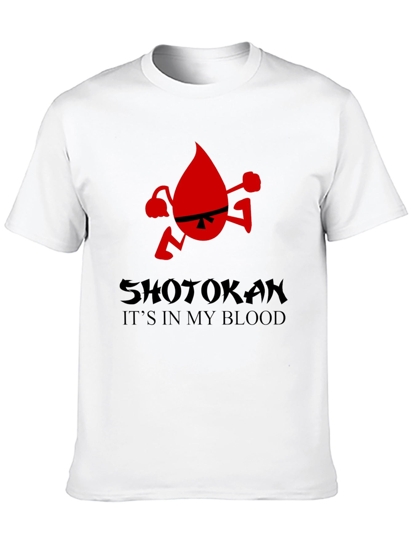 Show off your love for Shotokan karate with this unique graphic tee! The black t-shirt features a bold, red graphic of a blood drop character sporting a black belt and boxing gloves, with the words 'SHOTOKAN' and 'IT'S IN MY BLOOD' printed beneath. Made from comfortable, breathable fabric, this shirt is perfect for training, casual wear, or showing your karate pride. The eye-catching design is sure to turn heads and spark conversations among fellow martial arts enthusiasts. Whether you're a seasoned karateka or a dedicated fan, this t-shirt is a must-have addition to your wardrobe. Get yours today and wear your passion!