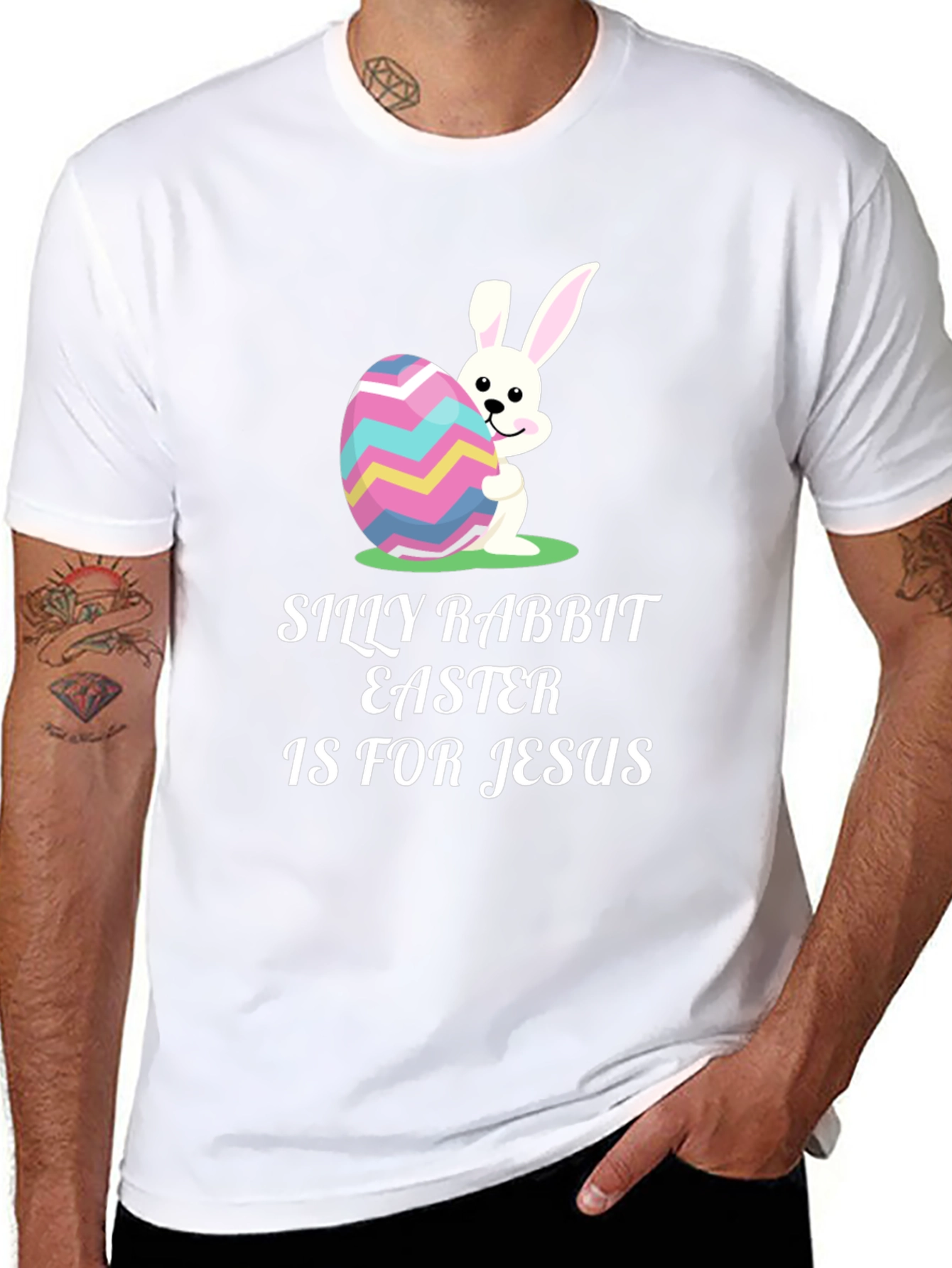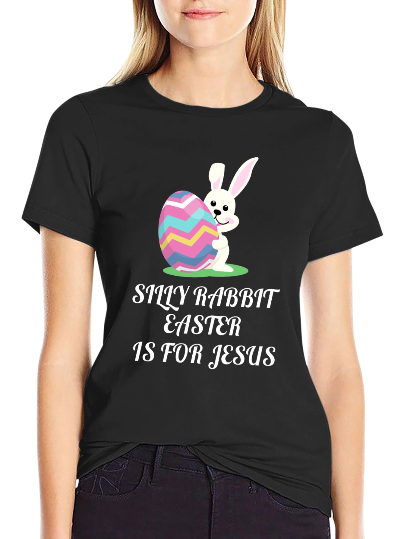Celebrate Easter with a touch of humor in this unique black t-shirt. The tee features a playful design with a white cartoon rabbit hugging a colorful zigzag patterned Easter egg. Above the graphic, the text "Silly Rabbit Easter is for Jesus" is printed in a bold white font. Made from a comfortable, breathable fabric, this shirt is perfect for Easter egg hunts, family gatherings, or casual wear during the spring season. Show your festive spirit and spread joy with this eye-catching and conversation-starting t-shirt.