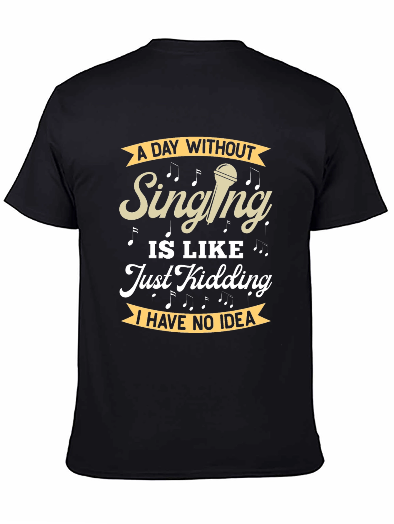 Show off your love for music with this humorous black t-shirt. The shirt features a unique graphic print with the saying "A Day Without Singing is like...Just Kidding I HAVE NO IDEA," incorporating musical notes and a microphone design. Made from what appears to be a comfortable cotton blend, this tee is perfect for casual wear, music events, or just lounging around. Its clever design will surely spark conversations and bring a smile to anyone's face. Great for singers and music lovers with a sense of humor!