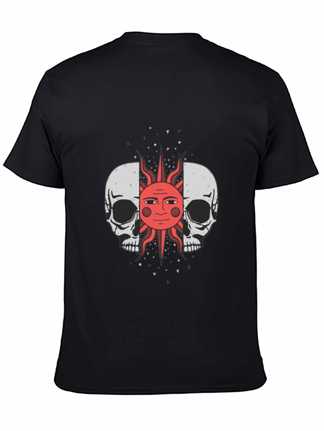 Embrace edgy style with this unique black graphic tee. The striking design features two skulls flanking a bold sun graphic. The contrasting imagery creates a visually captivating aesthetic, perfect for expressing individuality. Made from a comfortable and breathable fabric, this tee is ideal for everyday wear, concerts, or casual outings. Stand out from the crowd with this statement piece that effortlessly blends dark and vibrant elements. It's a perfect gift for those who appreciate distinctive designs and alternative fashion.