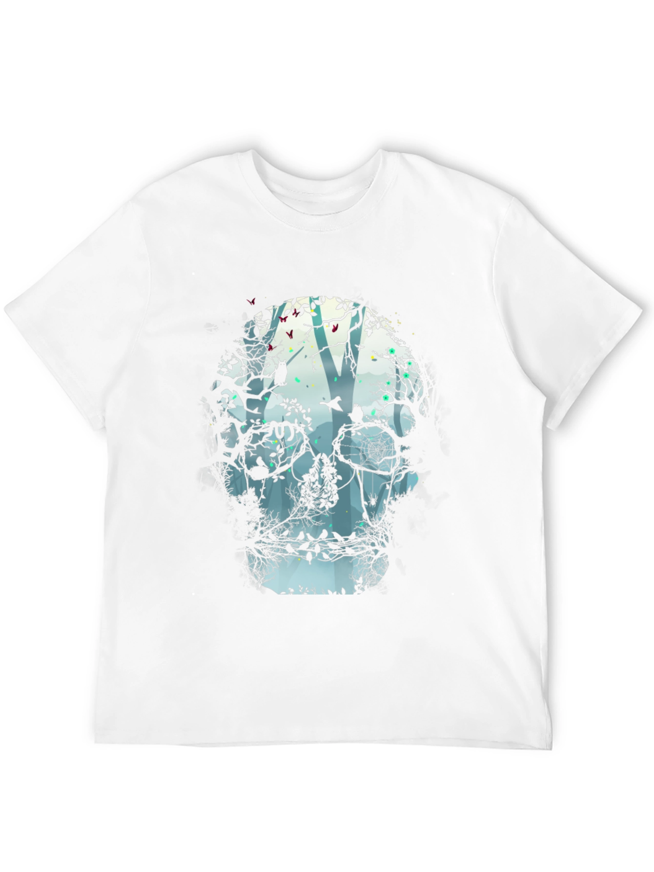 Embrace a unique blend of nature and mystique with this black graphic tee. The shirt features an intricate design of a skull filled with a detailed forest scene, complete with trees, birds, and a subtle spiderweb. Made from a comfortable fabric, this unisex t-shirt offers a relaxed fit suitable for everyday wear. Ideal for casual outings, concerts, or adding an edgy touch to your wardrobe. The design is eye-catching and sure to spark conversation. Pair it with jeans or shorts for a versatile look that showcases your individual style. Show off your love for nature and the enigmatic with this one-of-a-kind tee.