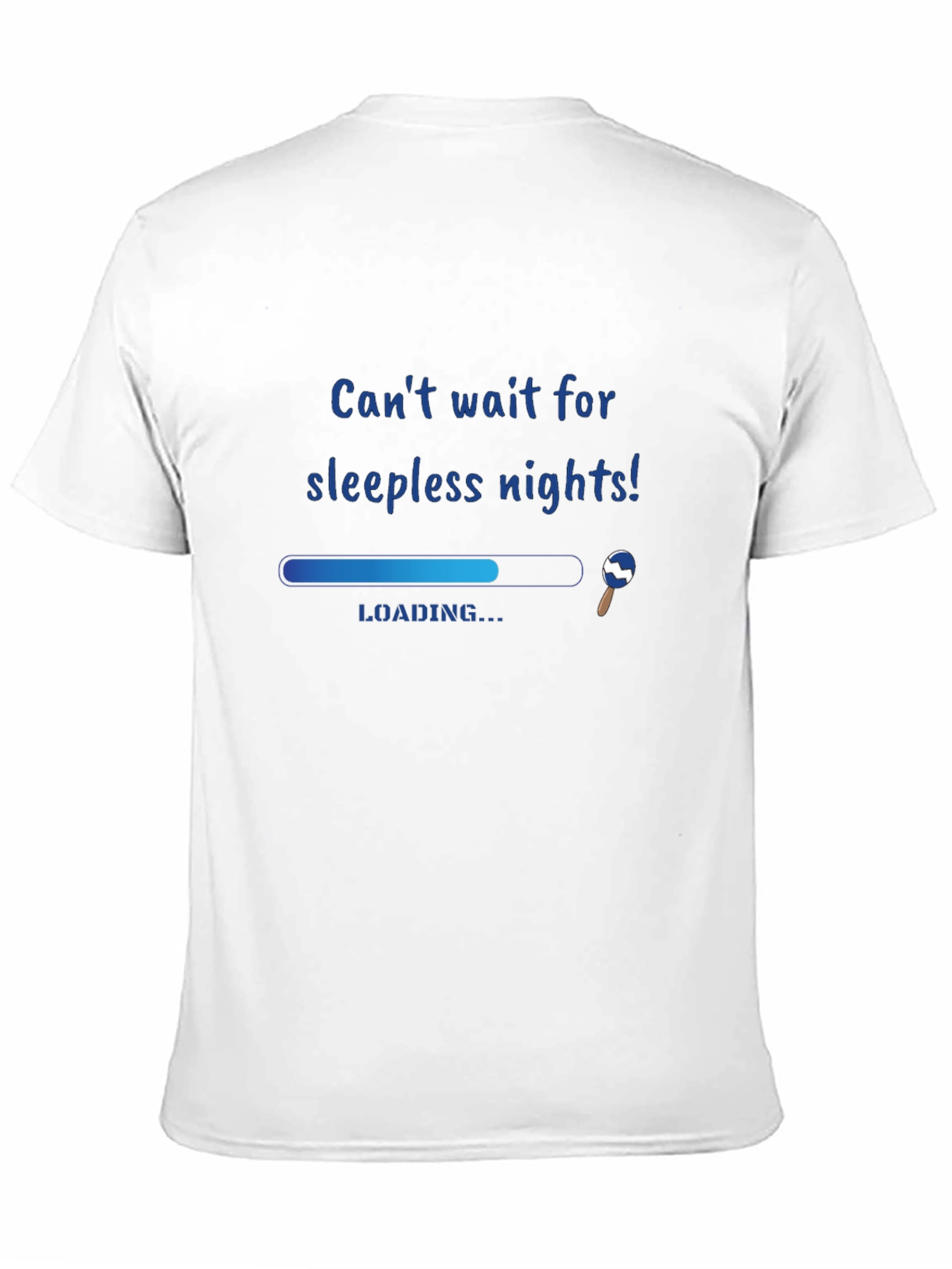 Embrace the upcoming sleepless nights with this unique graphic t-shirt. The black tee features a playful loading bar design, accompanied by the text "Can't wait for sleepless nights!" This shirt is perfect for expectant parents or anyone who enjoys a touch of humor. The design includes an artistic pacifier detail, adding charm to the overall look. This casual, comfortable tee is ideal for everyday wear, lounging at home, or making a fun statement. Show off your anticipation with this eye-catching and comfortable shirt. A great conversation starter!