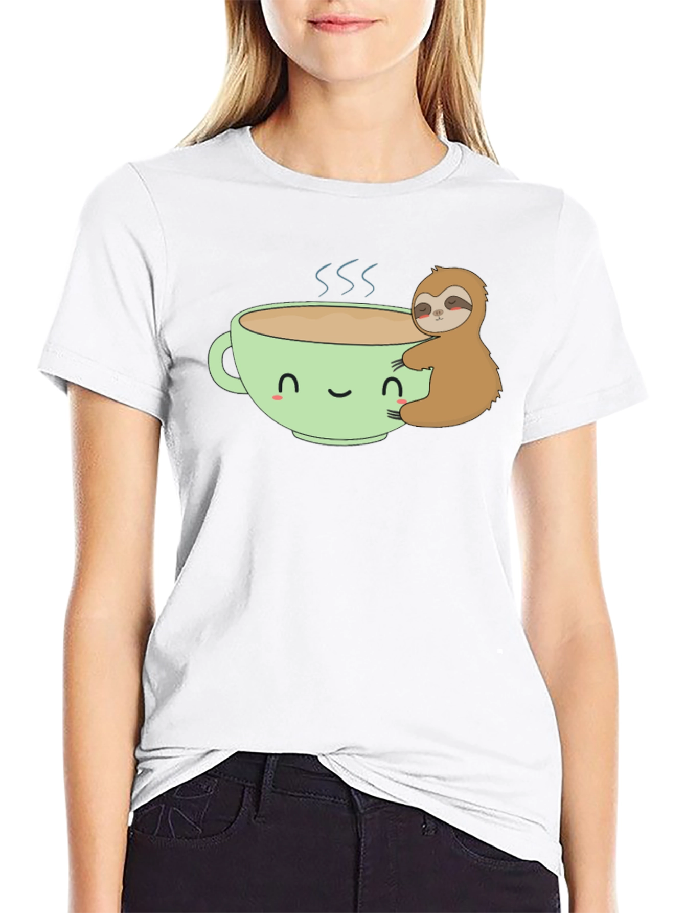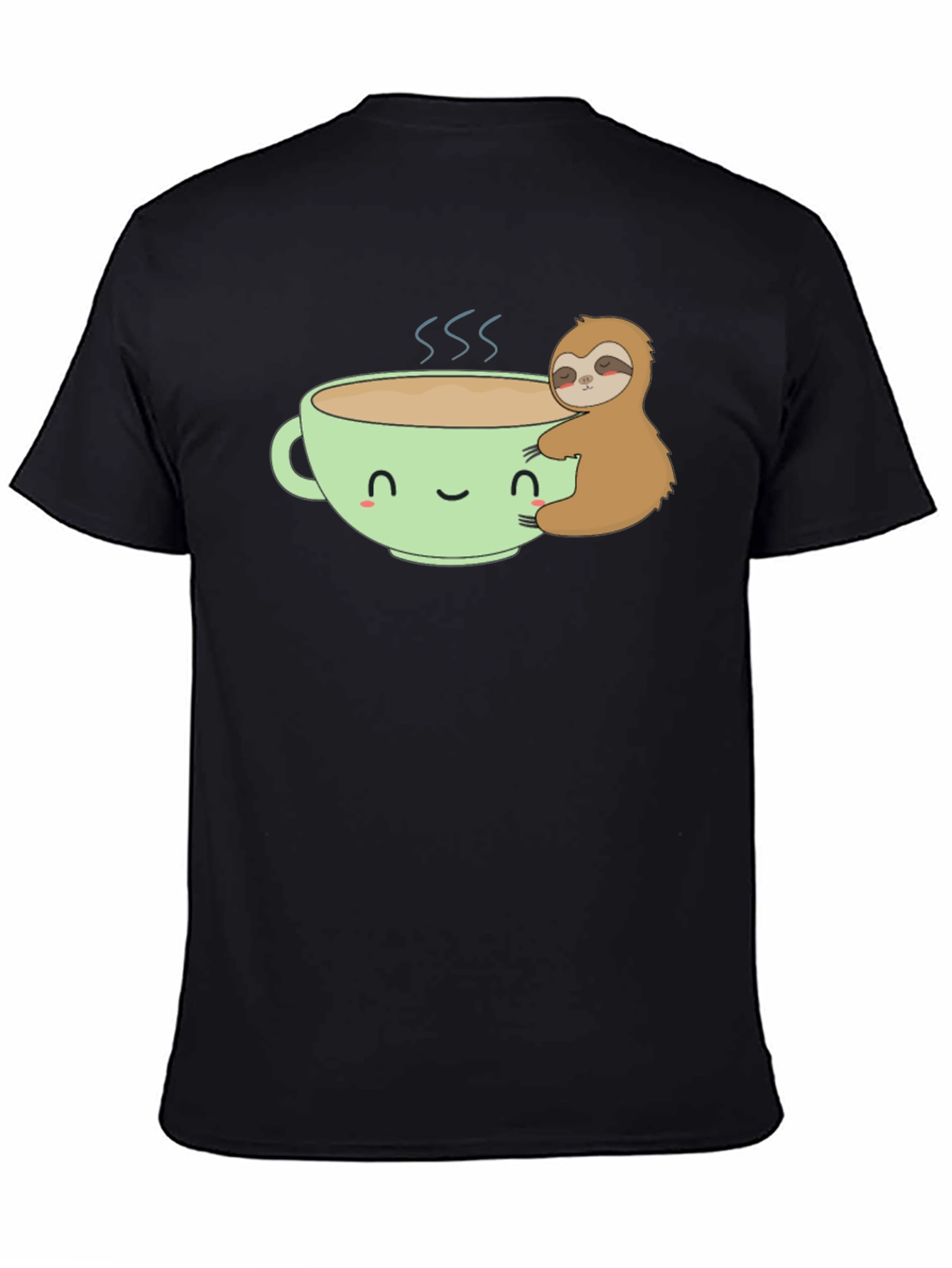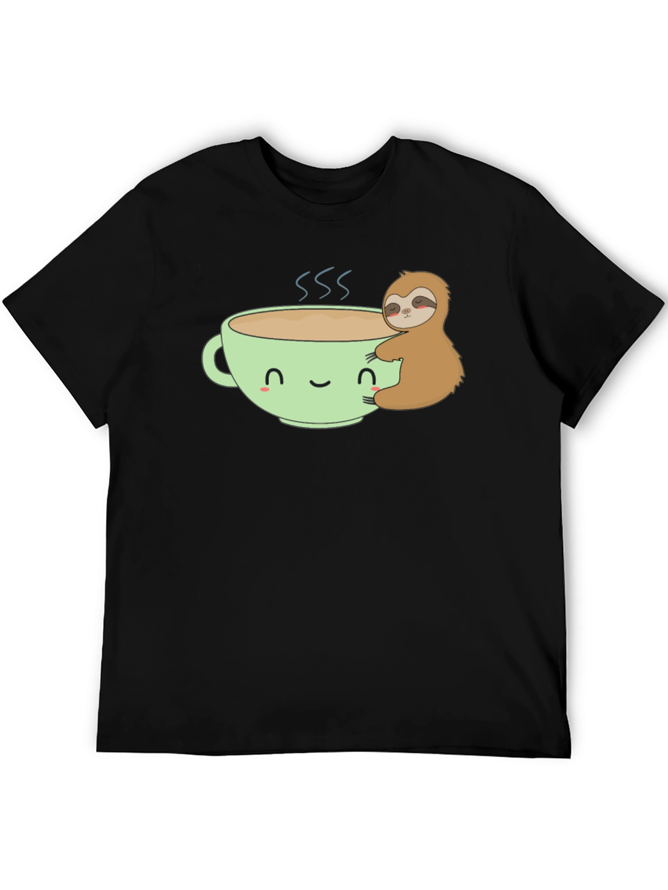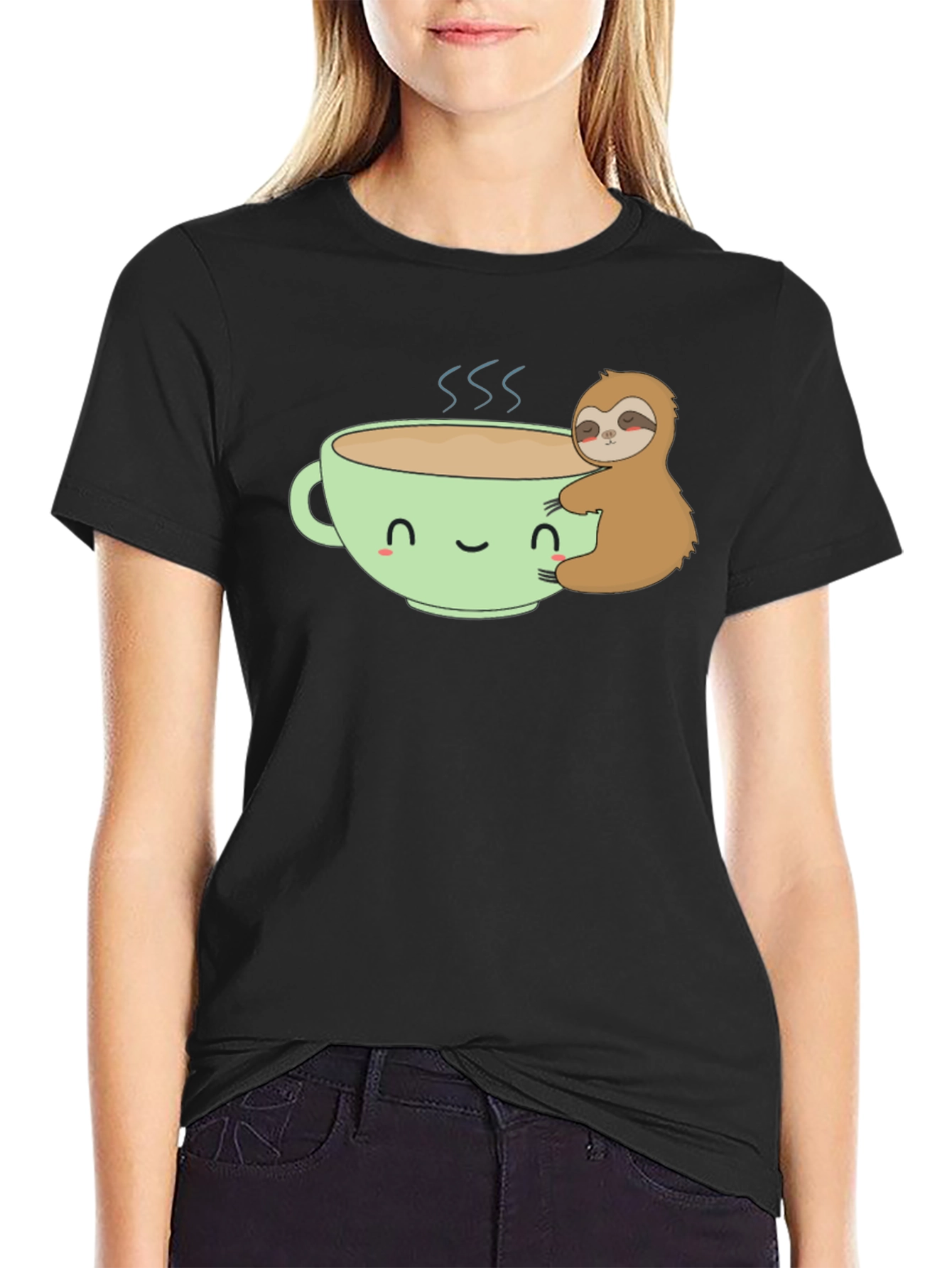 This adorable black t-shirt features a charming graphic print. The design showcases a cute sloth happily hugging a steaming coffee cup, complete with a smiling face. The light green cup is filled with what looks like delicious coffee. Made from a soft, comfortable fabric, this tee is perfect for casual wear and lounging around the house. It is a fun conversation starter and makes a great gift for coffee lovers and sloth enthusiasts alike. Wear it to your favorite coffee shop, on a relaxed weekend outing, or simply when you want to add a touch of whimsy to your day.
