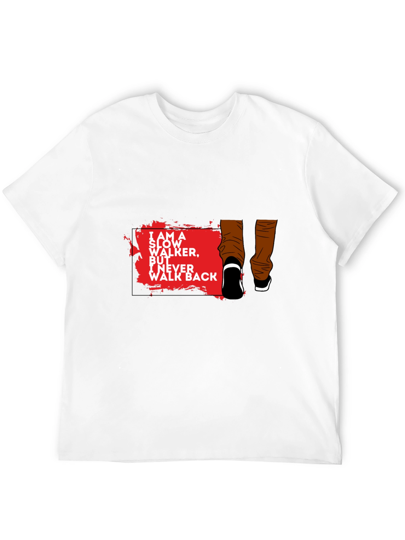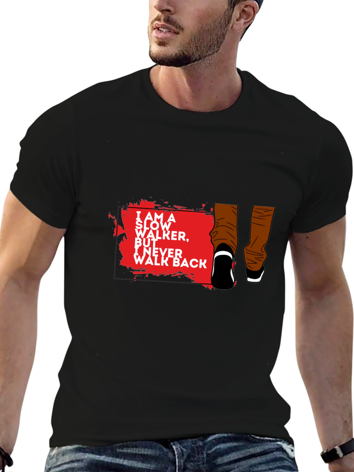 Embrace your inner determination with this stylish black graphic tee. Featuring the bold statement "I AM A SLOW WALKER, BUT I NEVER WALK BACK" in red and white, this shirt showcases a unique design with silhouetted legs. The eye-catching graphic adds a touch of urban flair, making it perfect for casual wear and expressing your resilient spirit. Crafted from a comfortable fabric, it's ideal for everyday adventures, workouts, or simply making a statement. Stand out and show the world that persistence is key with this must-have tee.