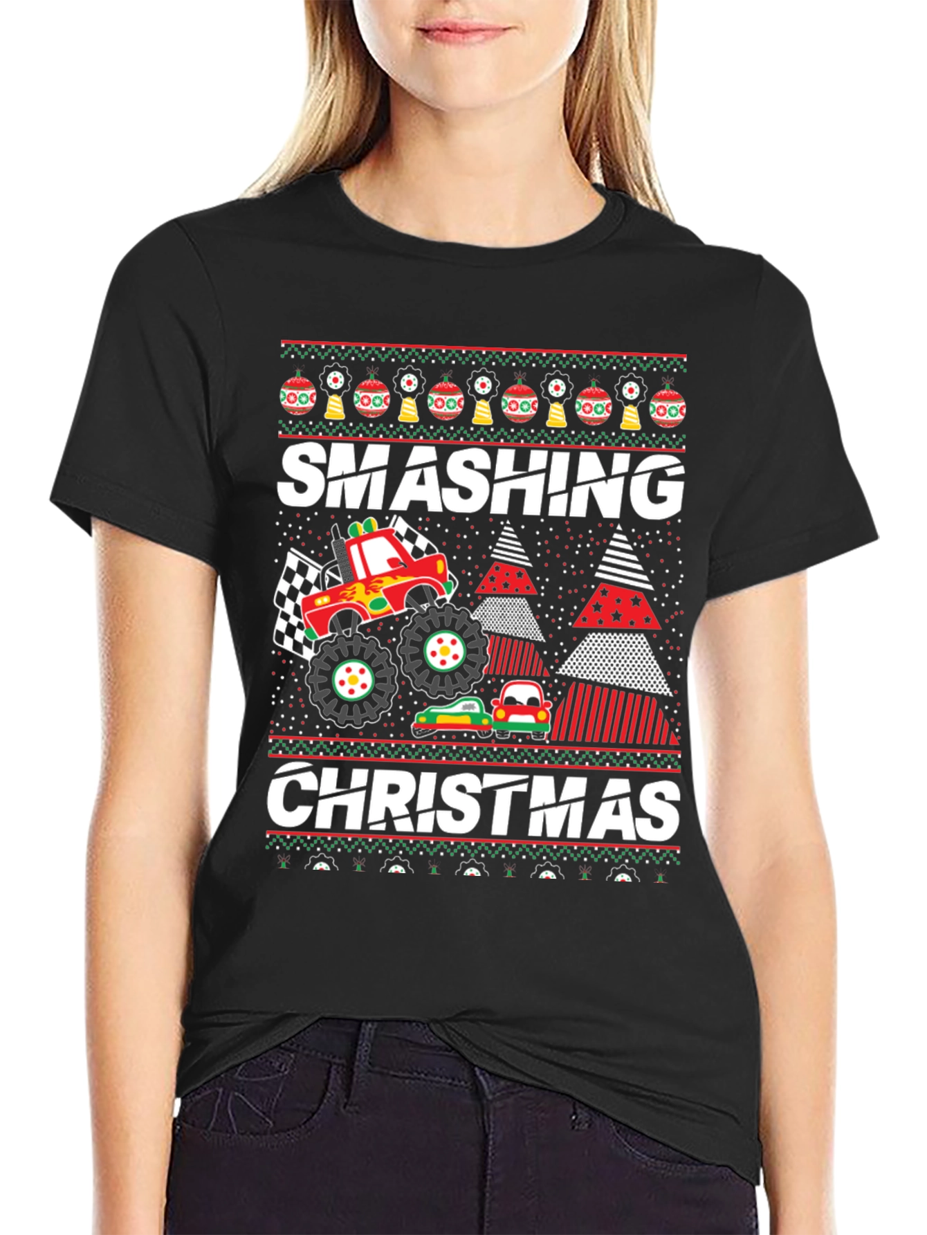 Get ready to rev up your holiday spirit with this unique 'Smashing Christmas' T-shirt! This black tee features a playful graphic of a monster truck with a checkered flag crushing a line of cars next to decorated Christmas trees, blending the thrill of monster truck rallies with the cheer of the holiday season. The festive design also includes Christmas ornaments and snowflakes, making it a standout choice for ugly sweater parties or casual holiday gatherings. Made from comfortable fabric, this T-shirt is perfect for anyone who wants to add a fun and quirky touch to their wardrobe. It's a great conversation starter and a must-have for those who love Christmas and monster trucks!