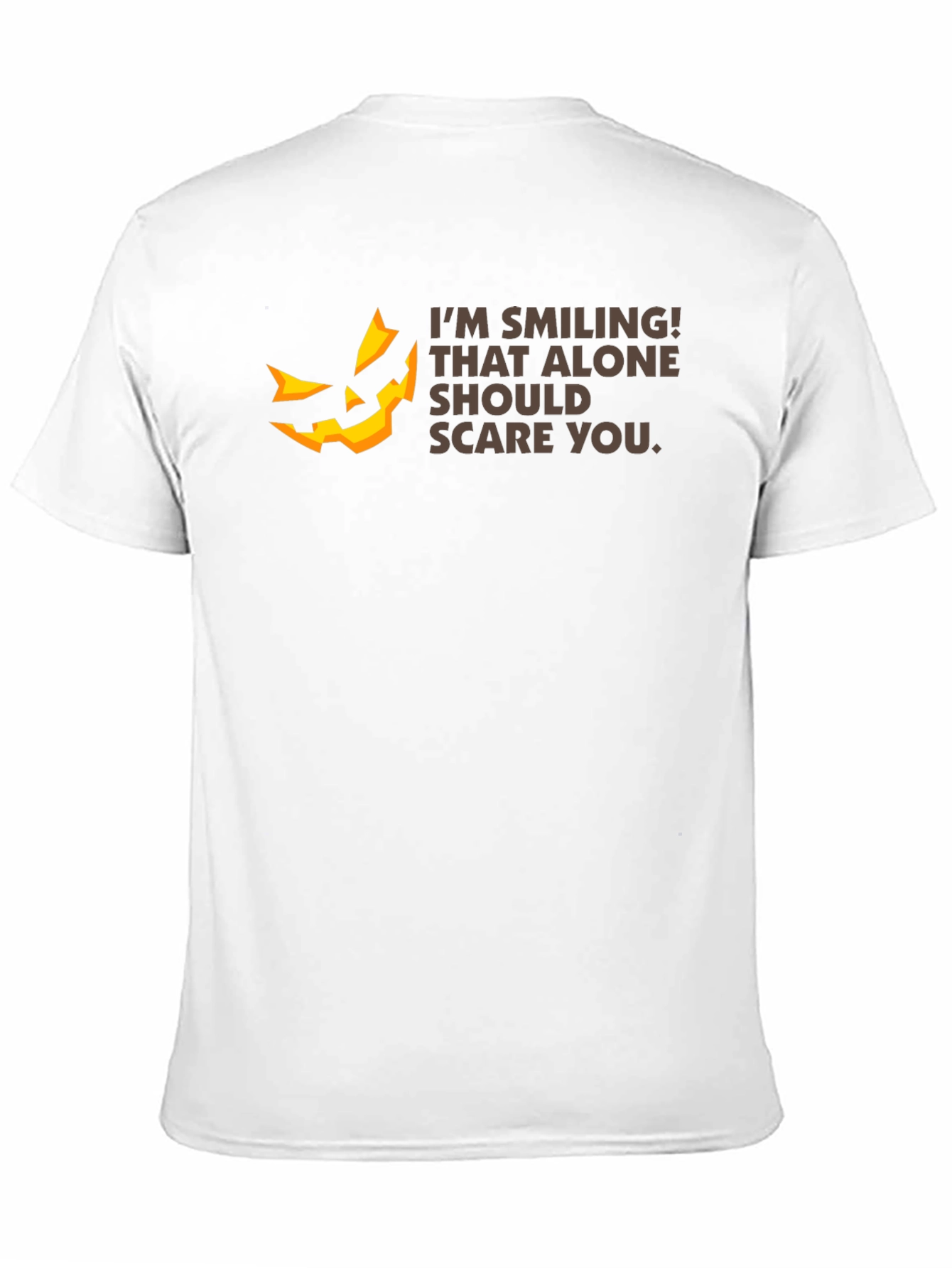 Get ready to make a statement this Halloween with this eye-catching black t-shirt! The tee features a spooky, geometric-style pumpkin grin and the text "I'M SMILING! THAT ALONE SHOULD SCARE YOU.". Made from what appears to be a soft, comfortable cotton blend, this t-shirt is perfect for Halloween parties, casual wear during the spooky season, or just showing off your unique sense of humor. The design is prominently displayed, ensuring you'll stand out. Embrace the Halloween spirit and add a touch of playful terror to your wardrobe with this unique graphic tee.