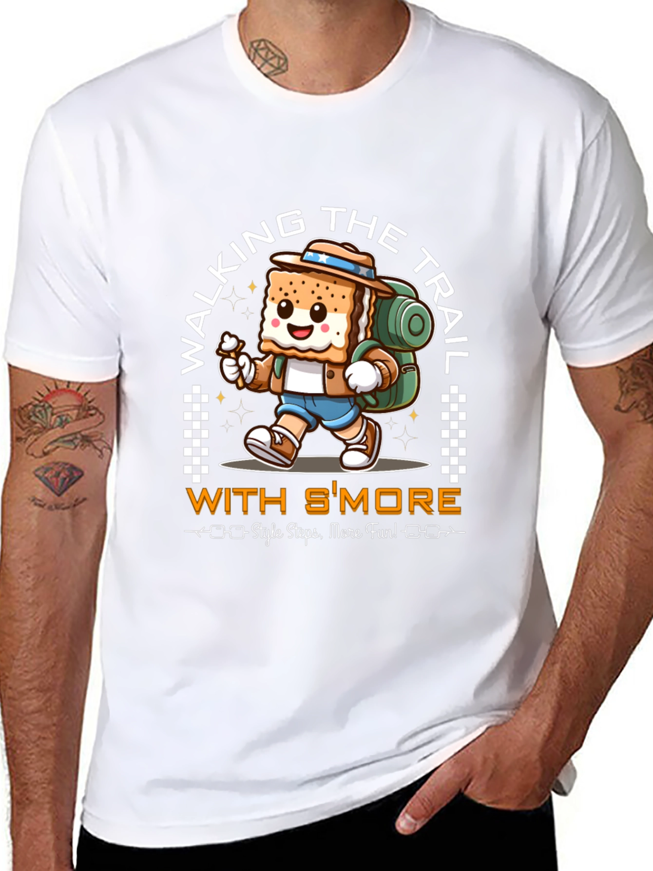Embrace your love for the great outdoors and sweet treats with this unique graphic tee. This black t-shirt features a delightful cartoon s'more character, complete with a hiking hat and backpack, ready for an adventure on the trail. The design includes the playful text "Walking the Trail With S'more - Style Steps, More Fun!", making it a perfect conversation starter. This eye-catching design is ideal for camping trips, hiking excursions, or simply expressing your fun-loving personality. A must-have for s'more enthusiasts and outdoor adventurers alike! Get yours today and showcase your love for hiking and delightful treats!