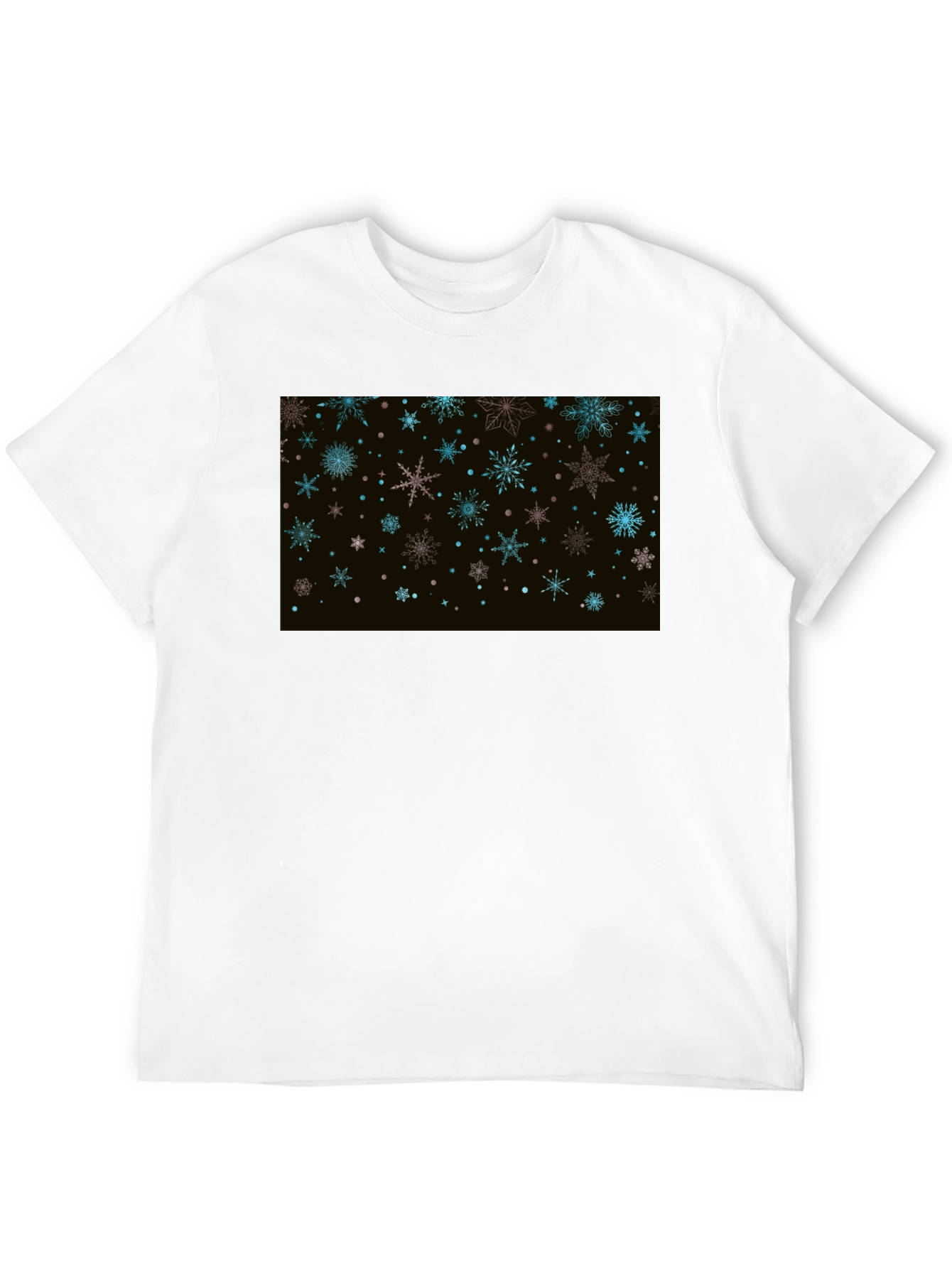 Embrace the winter spirit with this stylish black T-shirt featuring a unique snowflake pattern. The tee showcases an array of intricately designed snowflakes in varying sizes and colors, creating a festive and eye-catching design. Made from a comfortable, breathable fabric, this T-shirt is perfect for casual wear or layering under a jacket on cooler days. The classic crew neck and short sleeves provide a timeless silhouette. Ideal for holiday gatherings, winter events, or everyday wear, this snowflake T-shirt adds a touch of seasonal charm to any outfit. A must-have for those who love the beauty of winter.
