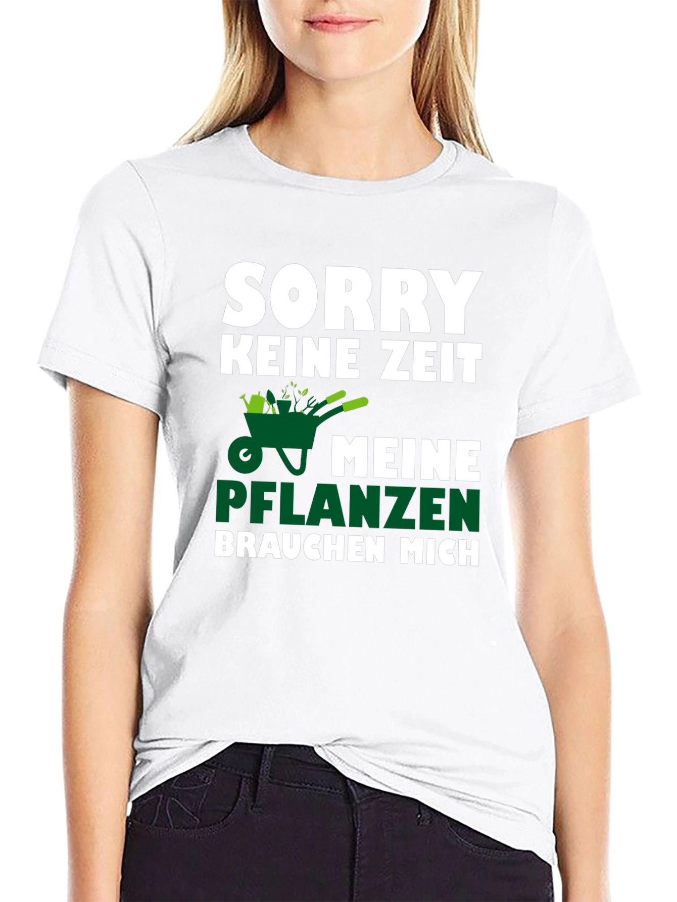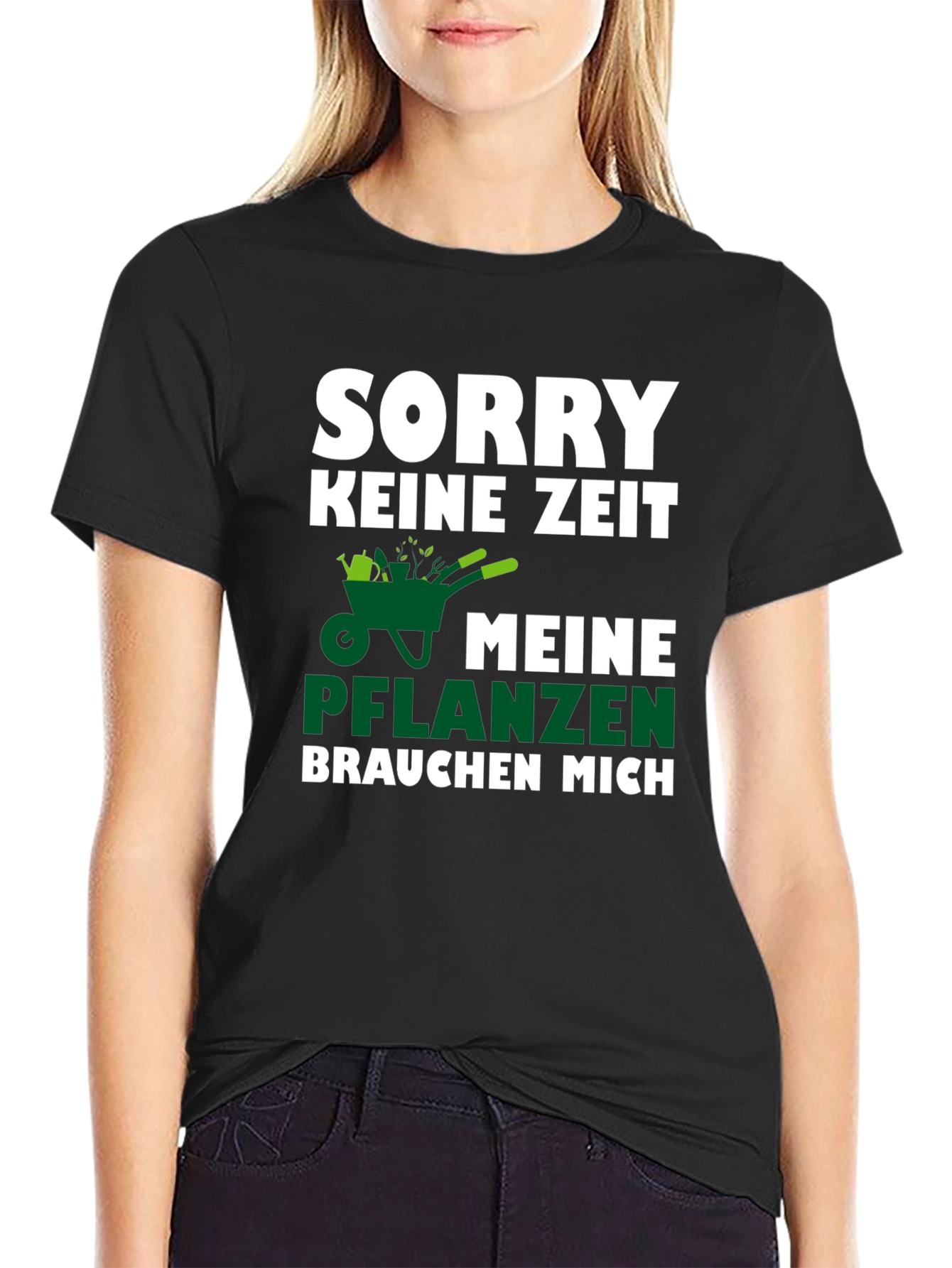 This black T-shirt features a playful design for gardening enthusiasts. The text "SORRY KEINE ZEIT" is printed in bold white letters above a green graphic of a wheelbarrow filled with plants. Below the graphic, "MEINE PFLANZEN" is printed in green, followed by "BRAUCHEN MICH" in white. This shirt is perfect for gardeners who want to show off their passion with a touch of humor. It's a great conversation starter at garden clubs, nurseries, or while tending to your plants. Comfortable and eye-catching, this T-shirt is ideal for casual wear and makes a fun gift for any plant lover.