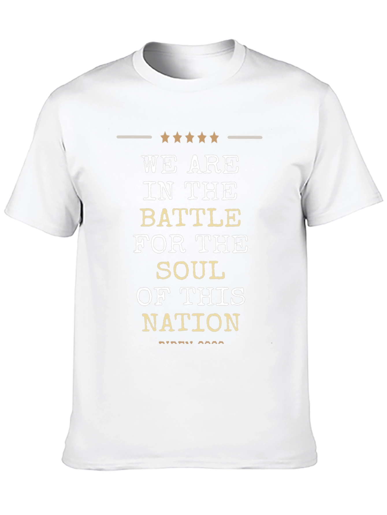 Show your patriotic spirit with this bold graphic T-shirt! Crafted from soft, breathable fabric, this black tee features a striking design with the words "WE ARE IN THE BATTLE FOR THE SOUL OF THIS NATION." The text is styled in classic fonts, with the words "BATTLE" and "NATION" highlighted in gold. Above the text are five gold stars, and a straight line above and below the graphic complete the look. Perfect for casual wear, rallies, or showing your support for your country.