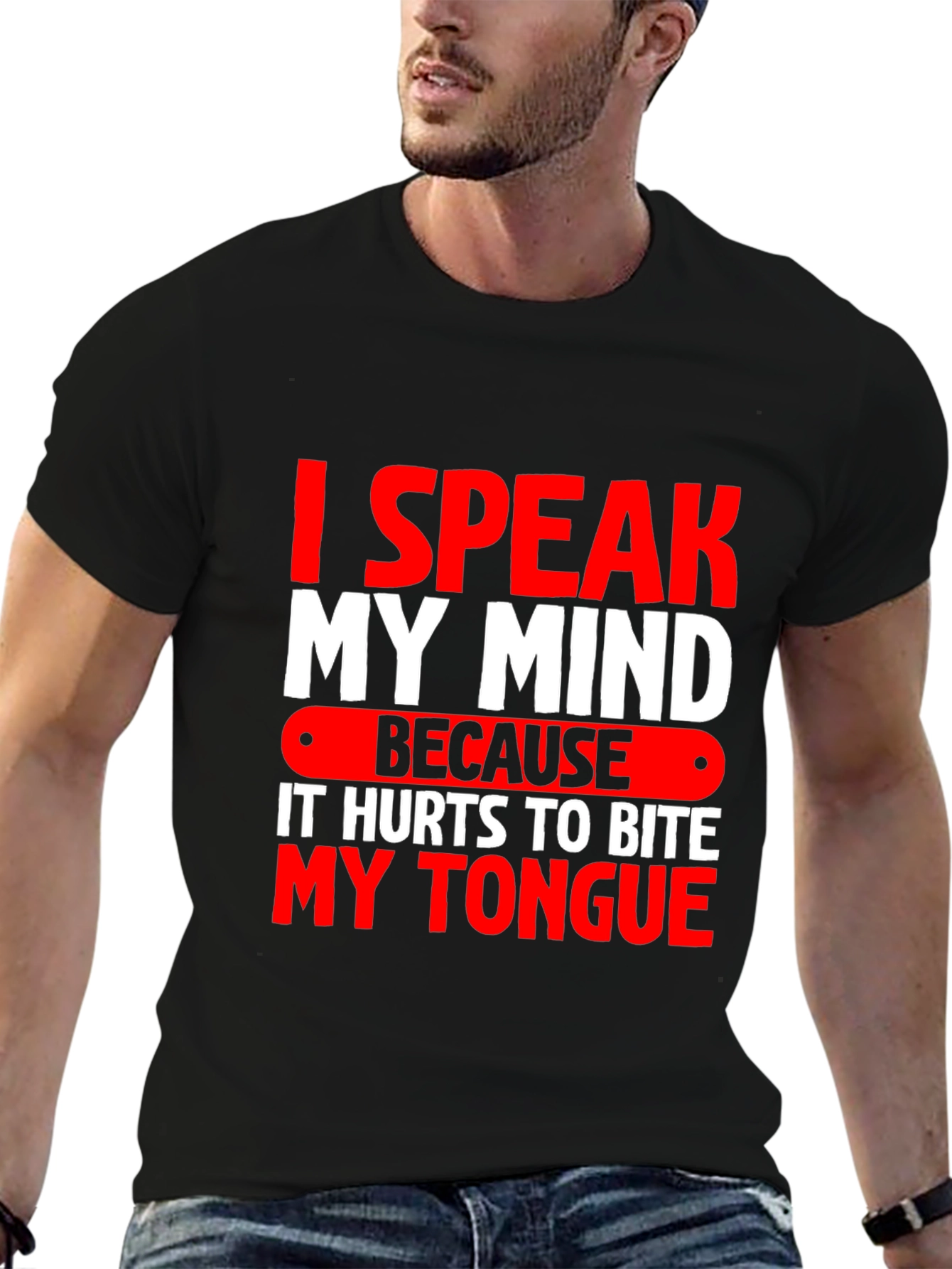 Express yourself boldly with this eye-catching black t-shirt. The shirt features a bold, attention-grabbing graphic in white and red, declaring "I SPEAK MY MIND BECAUSE IT HURTS TO BITE MY TONGUE." Made from what appears to be soft and comfortable cotton, this tee is perfect for everyday wear. The classic crew neck design and short sleeves offer a relaxed fit, making it ideal for casual outings, social gatherings, or simply lounging at home. Show off your personality and make a statement with this unique and stylish graphic tee.
