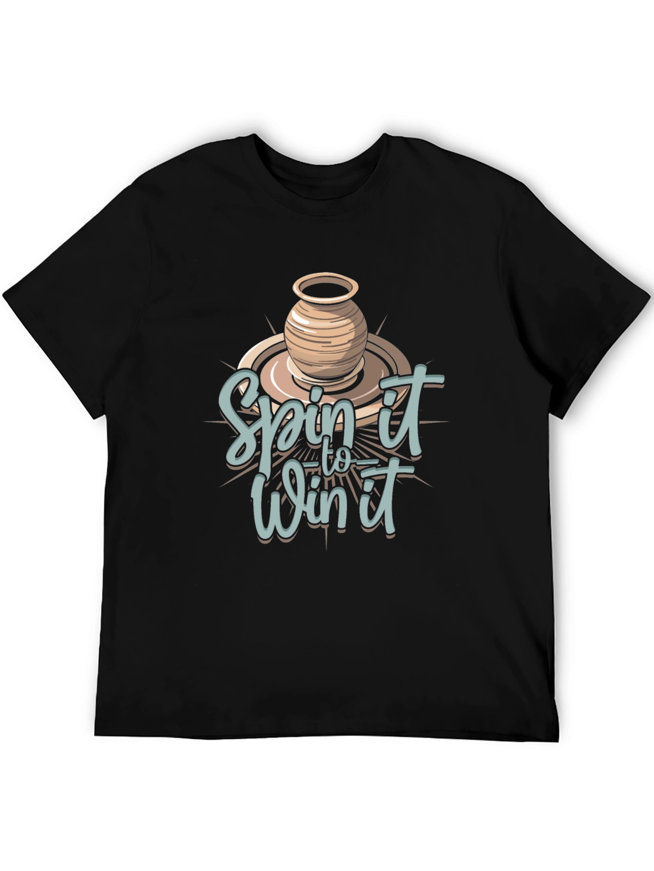 Show off your love for pottery with this unique t-shirt. This black t-shirt features a vibrant, stylized graphic of a pottery wheel with a pot on top. Emblazoned across the image is the phrase "Spin it to Win it" in a playful font, making it a fun and eye-catching design. Made from a soft and breathable fabric, this shirt is comfortable for everyday wear. Perfect for potters, artists, or anyone who enjoys creative expression. A great gift for pottery enthusiasts!