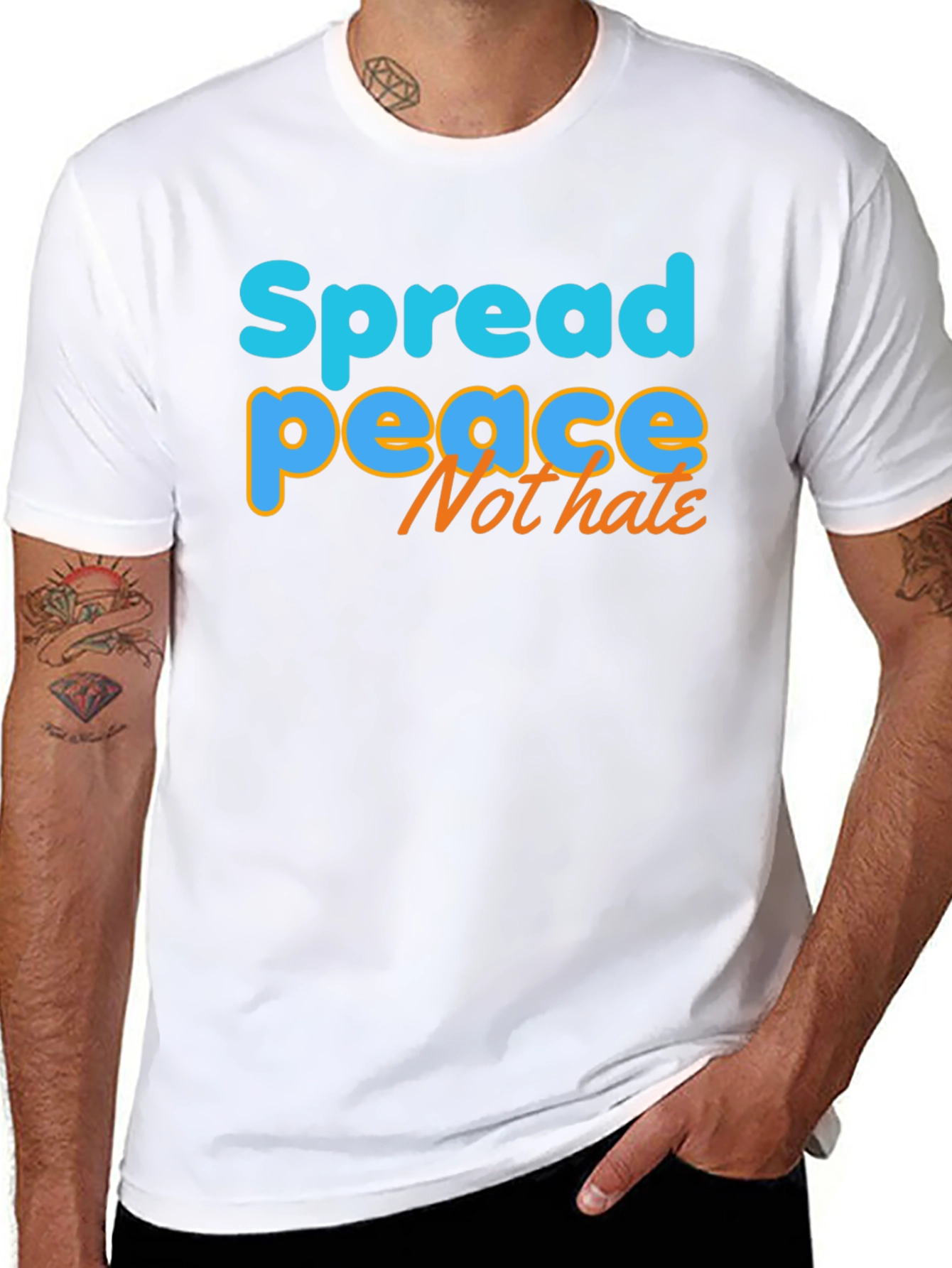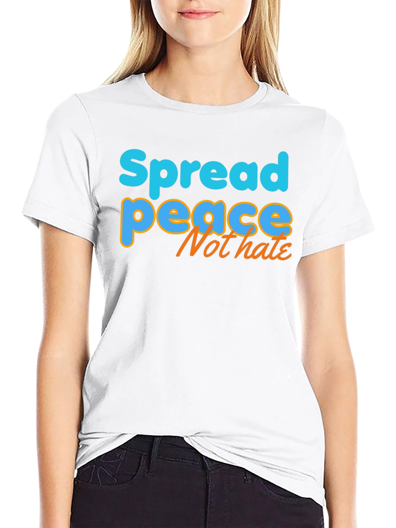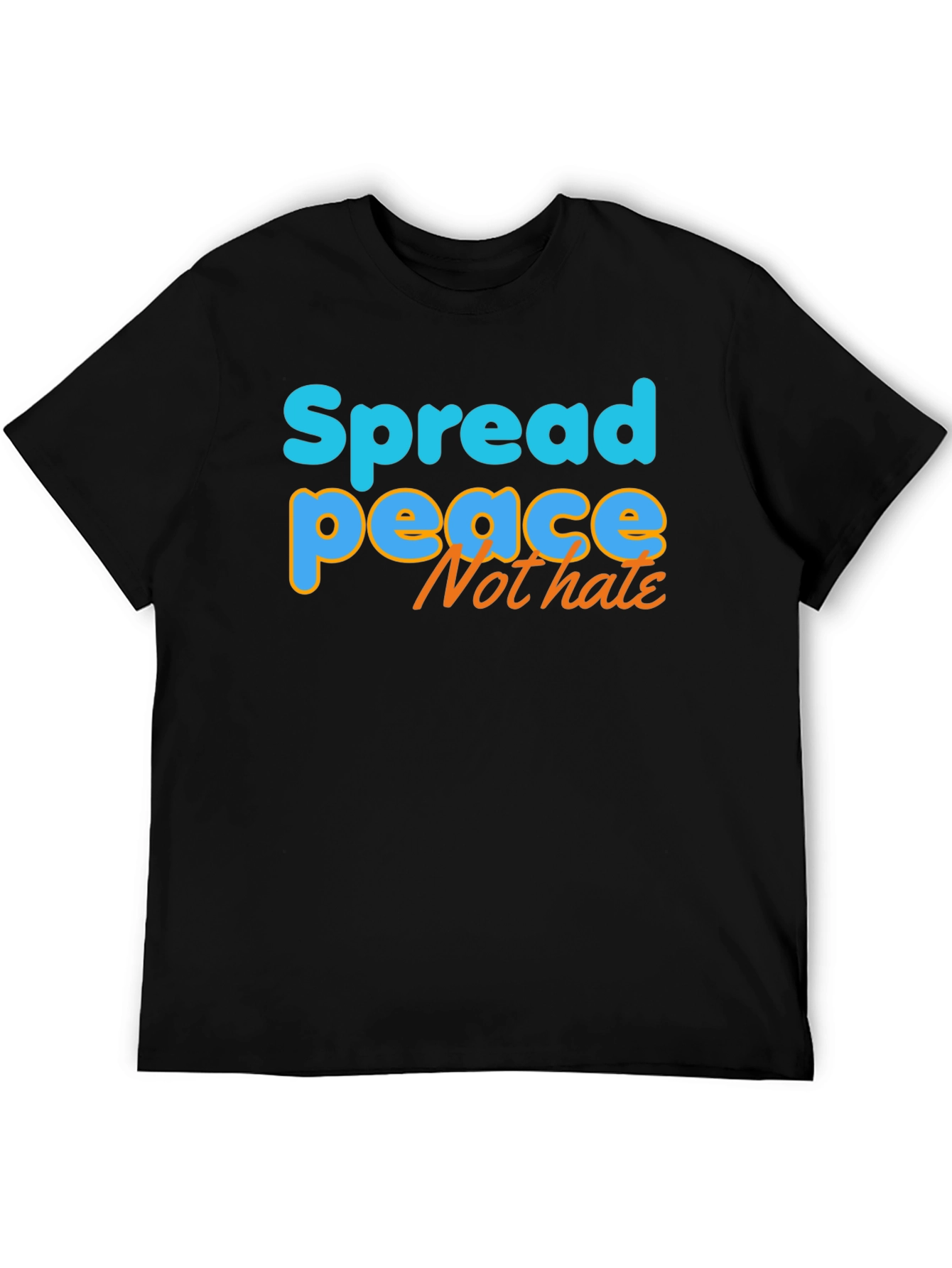 Embrace positivity with this stylish black t-shirt featuring a vibrant "Spread Peace Not Hate" graphic. The words "Spread" and "Peace" are written in bright blue with an orange outline, while "Not Hate" is written in orange. Made from a comfortable-looking, breathable fabric, this tee offers a relaxed fit perfect for everyday wear. The eye-catching design makes a statement, ideal for casual outings, social gatherings, or simply spreading good vibes. It's a conversation starter that promotes unity and kindness. Show your support for a positive message with this unique and comfortable t-shirt. This tee is not just clothing; it's a statement.