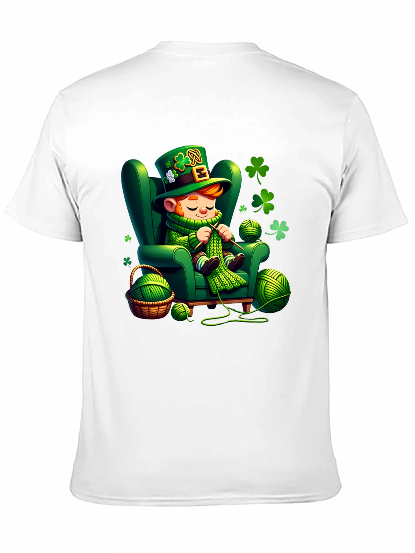 Celebrate St. Patrick's Day in style with this adorable t-shirt! Featuring a charming cartoon leprechaun cozily knitting in a green armchair amidst shamrocks and yarn, this tee is perfect for adding a touch of festive fun to your wardrobe. The design is printed on a comfortable, black fabric, ensuring both style and comfort. Show off your Irish spirit and love for crafting with this unique and eye-catching t-shirt. Ideal for St. Patrick's Day celebrations, casual outings, or as a fun gift for the crafty person in your life!