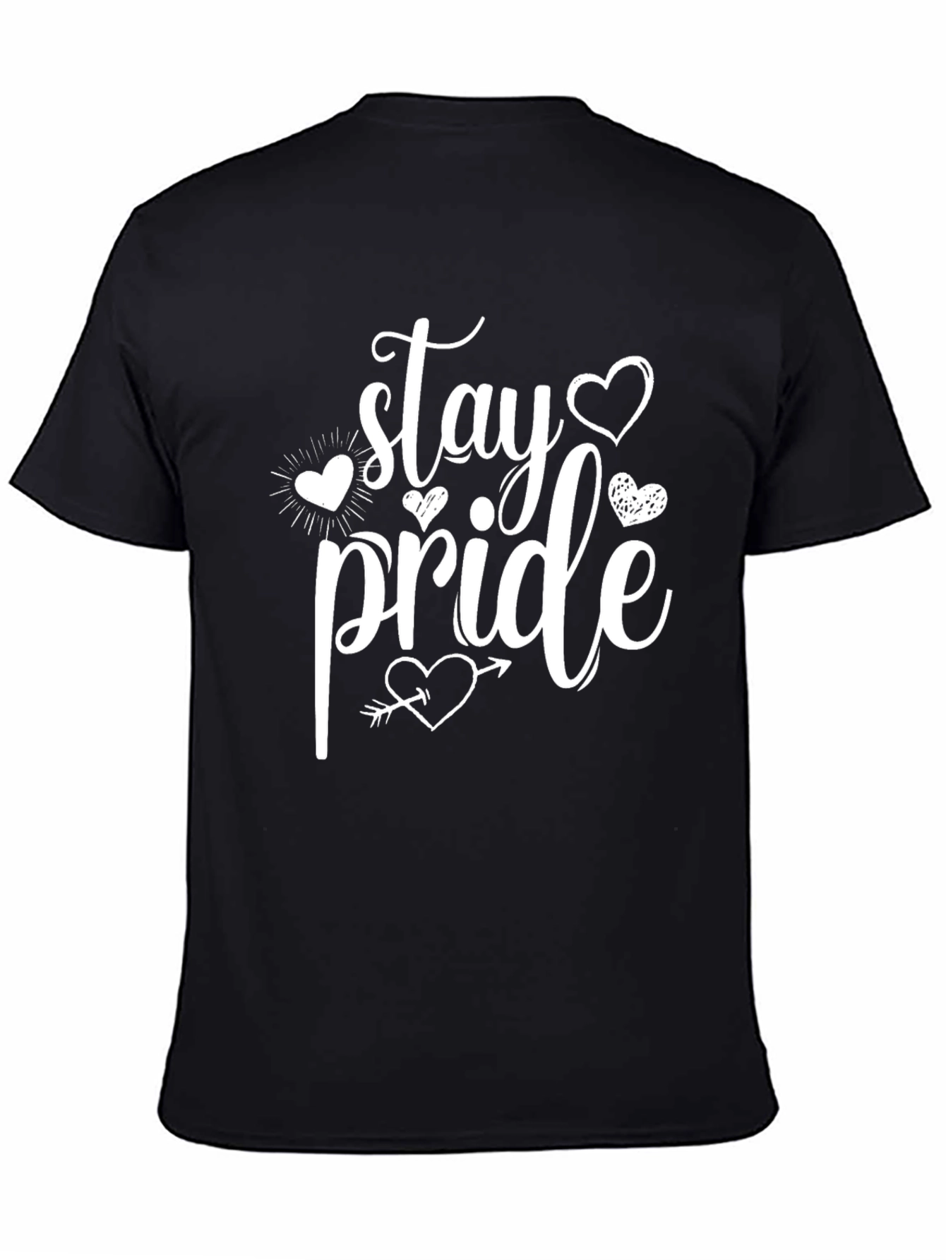 Show your pride in style with this classic black t-shirt. The design features the phrase 'Stay Pride' in a playful, handwritten-style font, adorned with charming heart accents and an arrow pierced heart. Perfect for expressing your identity or celebrating Pride Month, this tee is both meaningful and fashionable. The shirt is made from a comfortable material that ensures a great fit and lasting wear. Pair it with jeans, shorts, or a skirt for a casual, confident look. Makes a thoughtful gift or a personal statement piece.